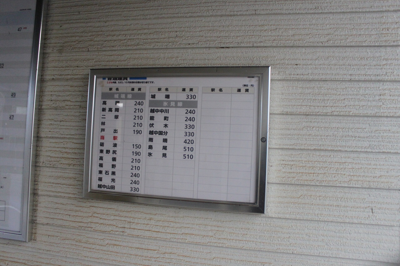 運賃表です。新高岡駅までは210円、高岡駅までは240円となっています。