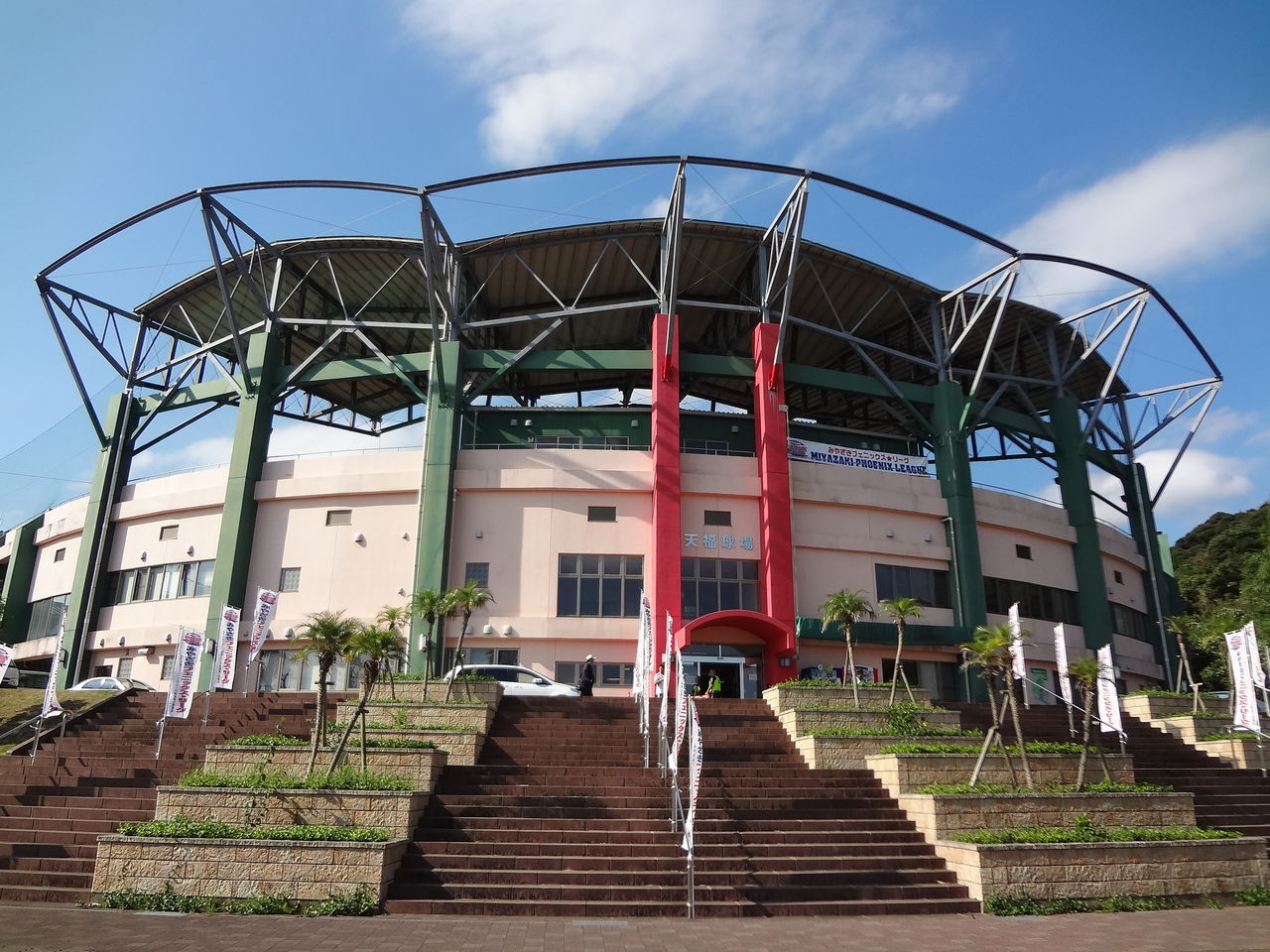 プロ野球フェニックスリーグの時期になるとカープファン以外も訪れる天福球場です。駅から近いのでとてもアクセスが便利なのが素晴らしいところです。