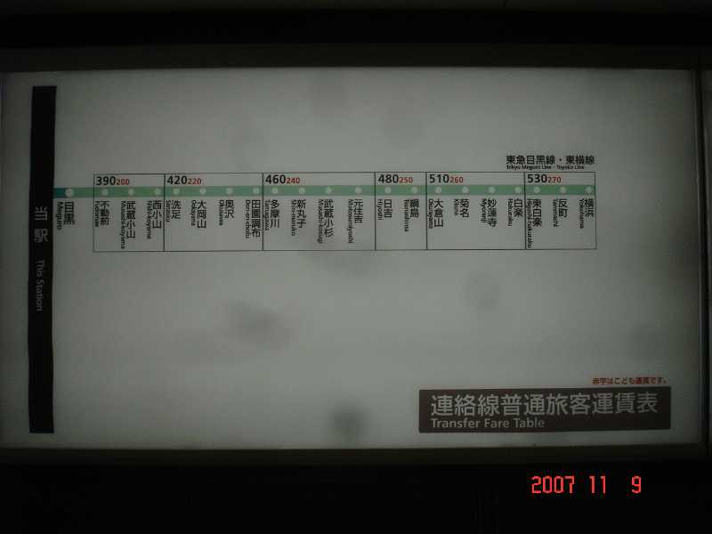 東京メトロ南北線目黒駅から先の東急線の運賃表です。平成19(2007)年時点での金額ですが後述の浦和美園までの運賃で東京メトロの場合は目黒を通り越し元住吉駅まで行けてしまいます。
