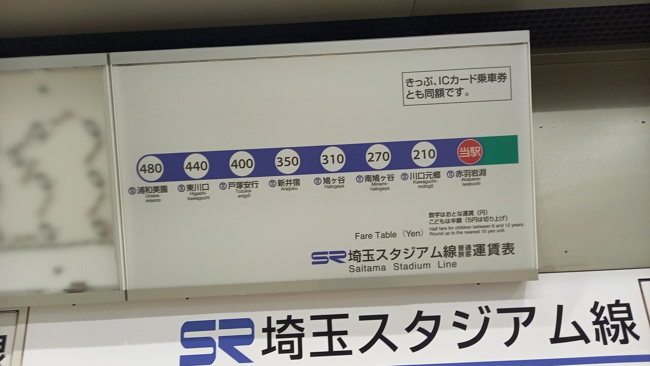 埼玉高速鉄道の運賃表です。14.6キロの浦和美園駅までの運賃が480円という驚異の設定となっています。