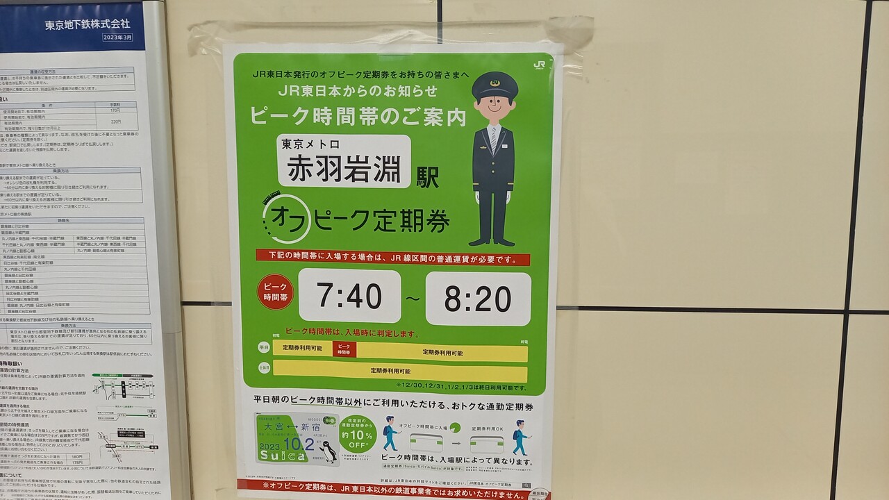 JR東日本が設定しているオフピーク定期券のピーク時間帯告知ポスターには7時40分から8時20分が使用不可時間と告知されています。