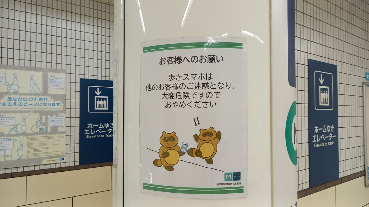 当駅はメトポン好きな後楽園駅の配下にあり、メトポンによる注意喚起看板があります。