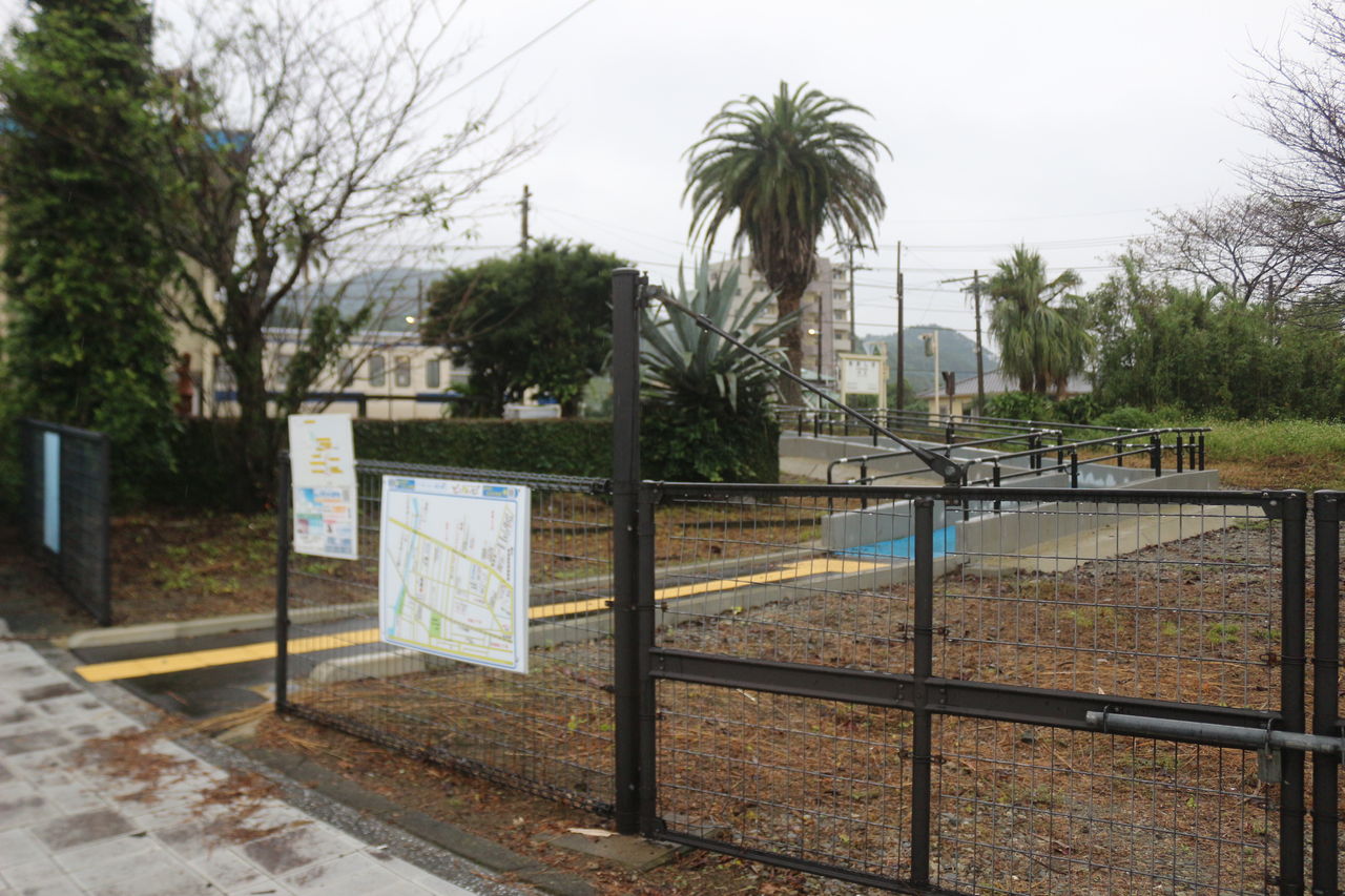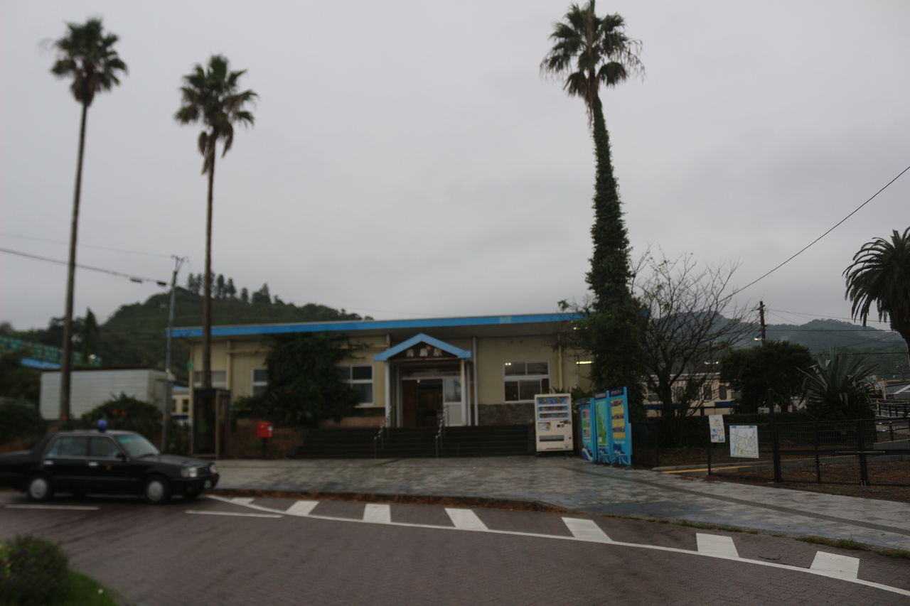 駅前は県道337号線から少し奥まった民宿や宅地が集中するエリアに設置されていて、椰子の樹が観光地最寄り駅の風情を漂わせています。駅の横の横断歩道を渡ると駅の裏側にも駐車スペースがあり観光バスなどが立ち寄ったりします。その上を国道220号(青島バイパス)が通っていることから、その手のバスはそっち側の方が便利ということなんでしょうね。