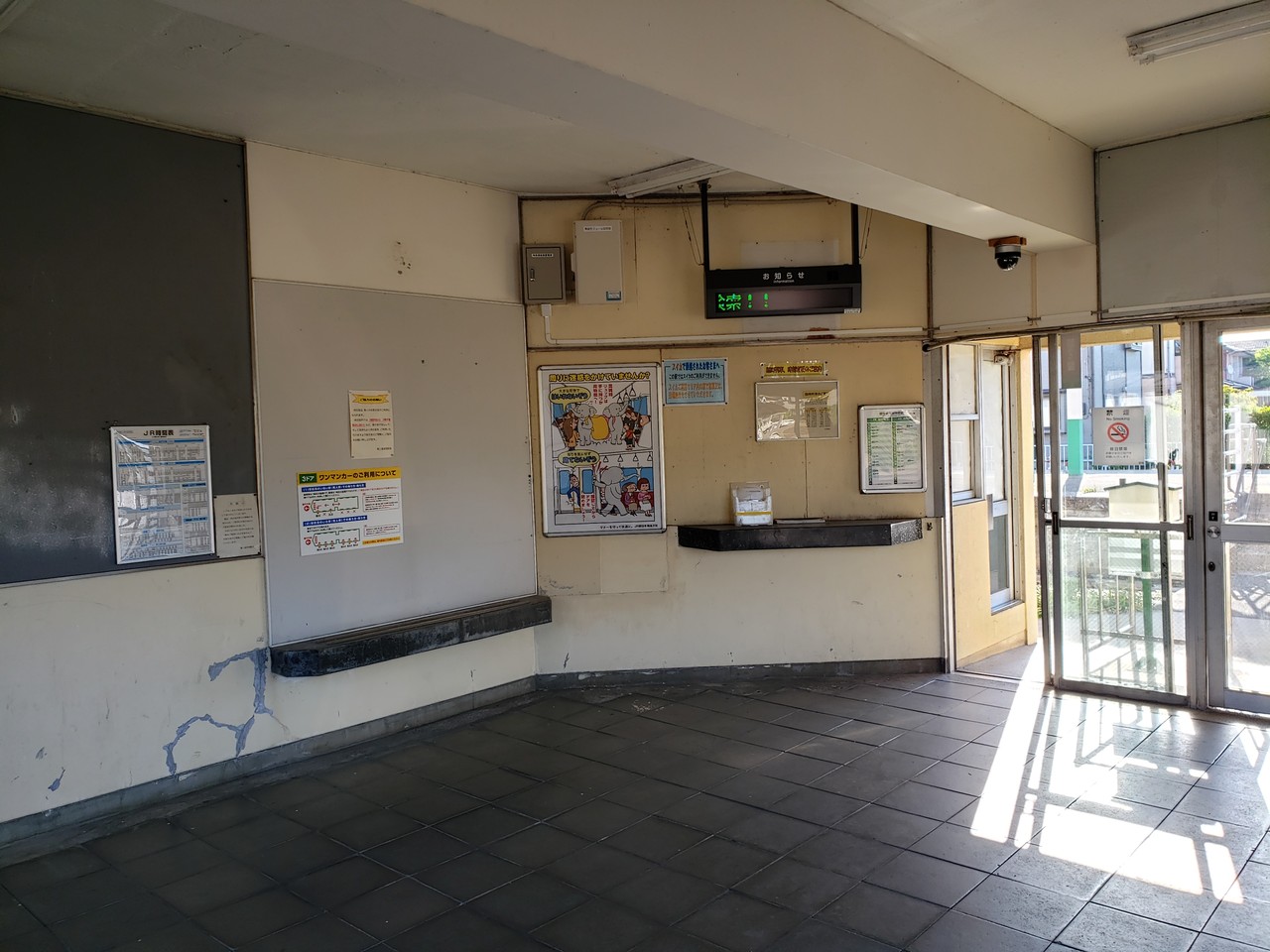 建物内はこのように係員が配置されていた頃の様子を色濃く残しています。出札窓口の他、荷物の取り扱い窓口の跡も残っています。