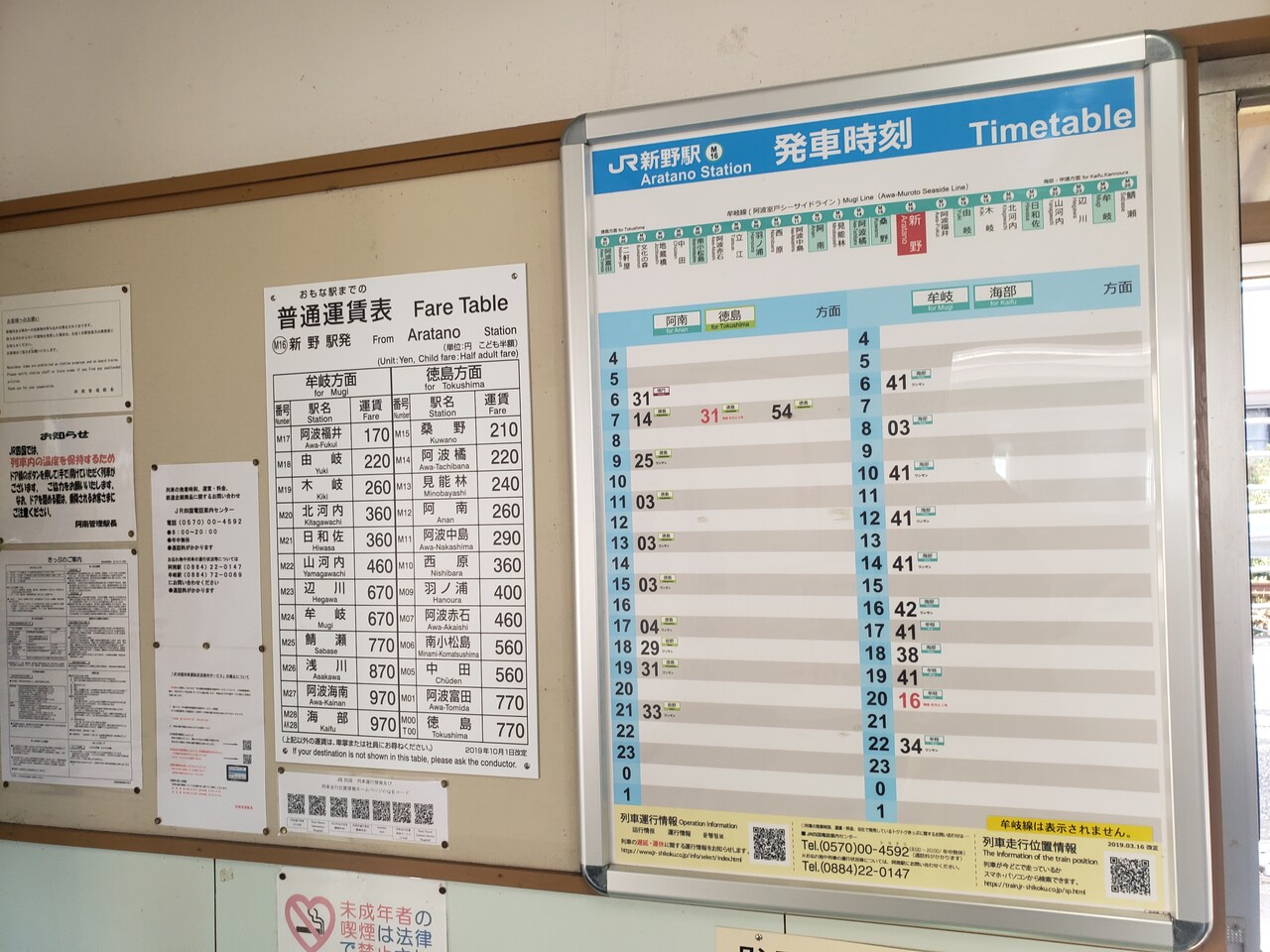 運賃表と時刻表です。上りは7時台に、下りは20時台に特急「むろと」が停車します。。