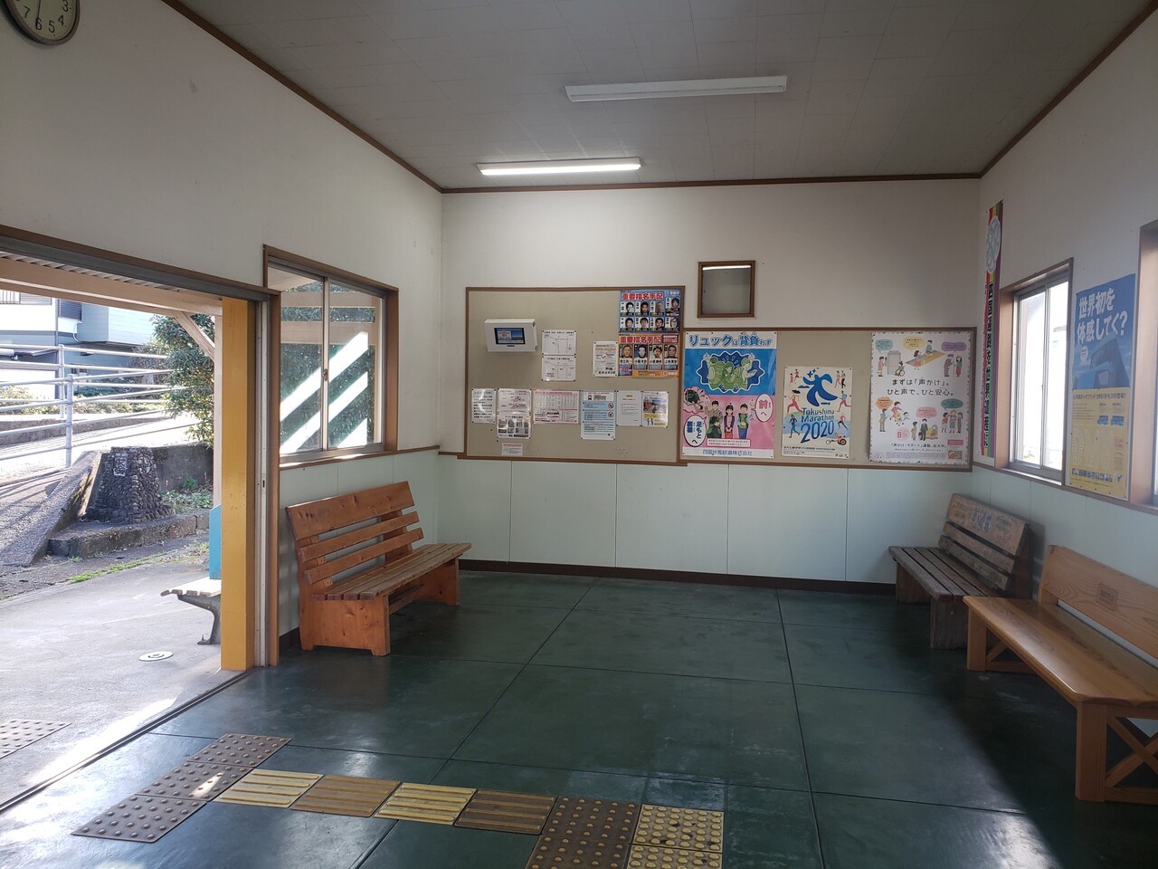 駅建物内は広々としています。かつて窓口があった個所はポスター掲示スペースになっています。自動券売機は設置されていません。
