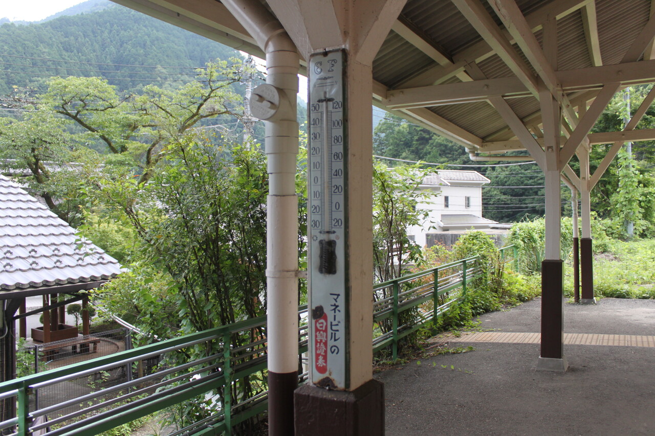1番線ホームには温度計が設置されていますが、ここの広告枠が「マネービルの日興証券」となっています。マネービル温度計は当方が廻った駅では大湊駅@大湊線と西条駅@篠ノ井線にあるのを確認しています。
