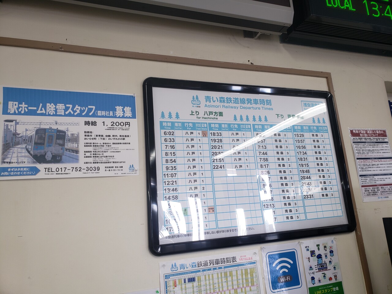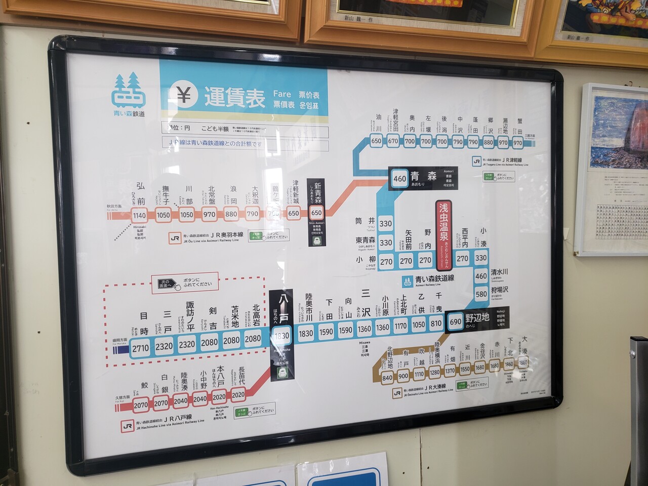 時刻表と運賃表です。青い森鉄道線は都市部の青森駅から当駅までは比較的本数が多く、折り返し列車が多数設定されていて、上下線の掲載本数がそれを如実に示しています。