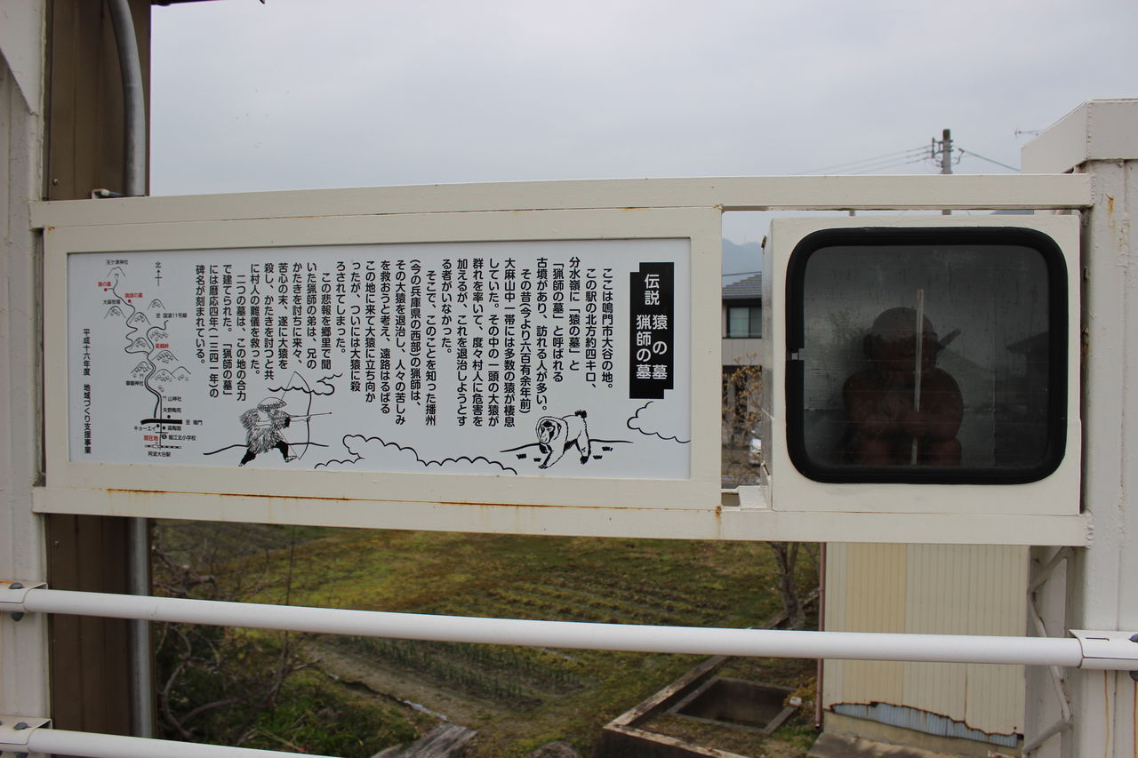 当駅の片隅には「伝説の『猿の墓』と『猟師の墓』」があるようで、その案内が出ていて、それにまつわる人形(?)が鎮座しています。
