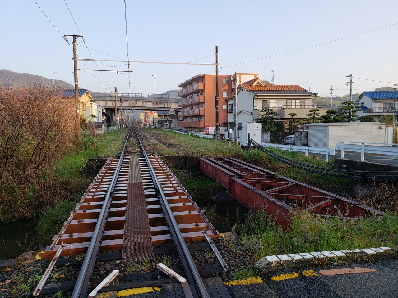 構外の踏切から当駅を眺めます。画像左側にかつて使われていたプラットホームが撤去されずに残されています。