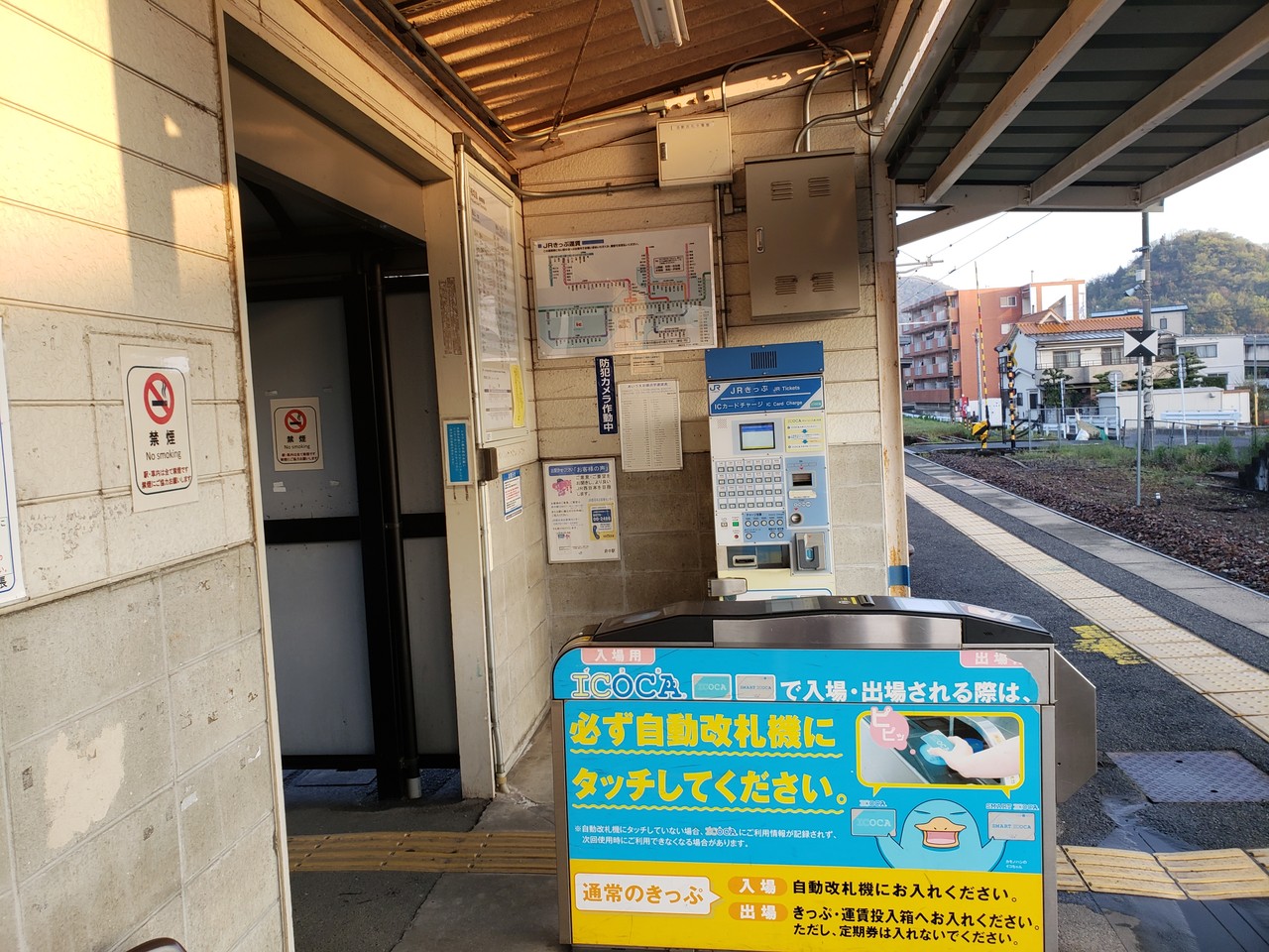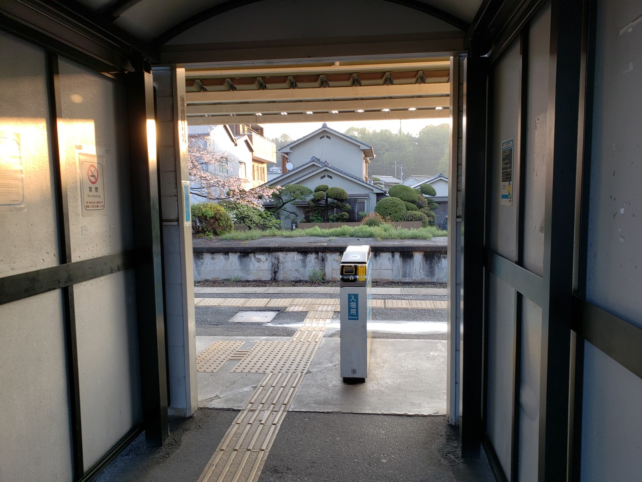 線路側から見た様子です。扉がついていない簡易型の自動改札機が設置されています。この自動改札機はICカードの他に紙のきっぷも処理できます。