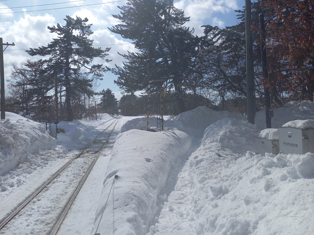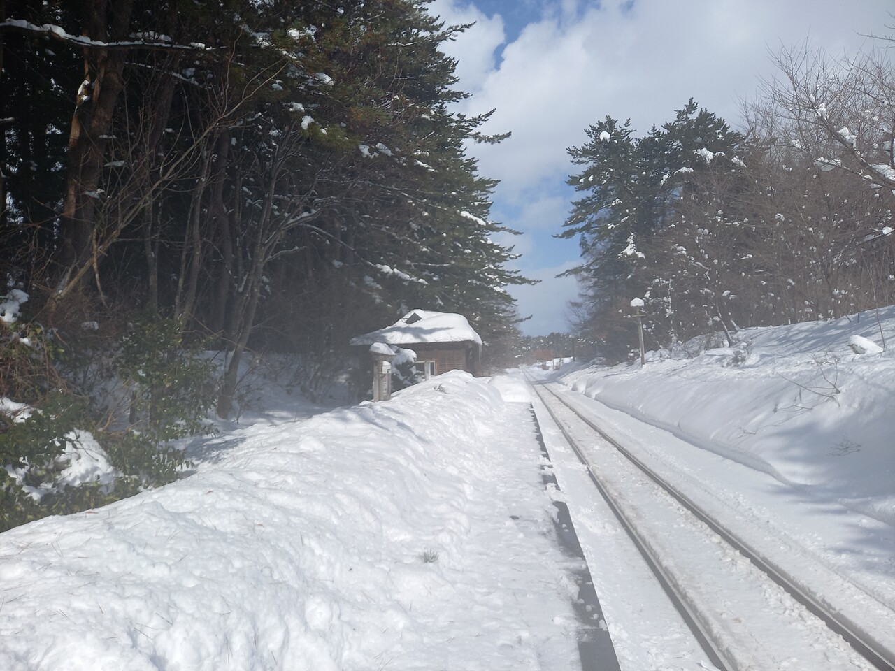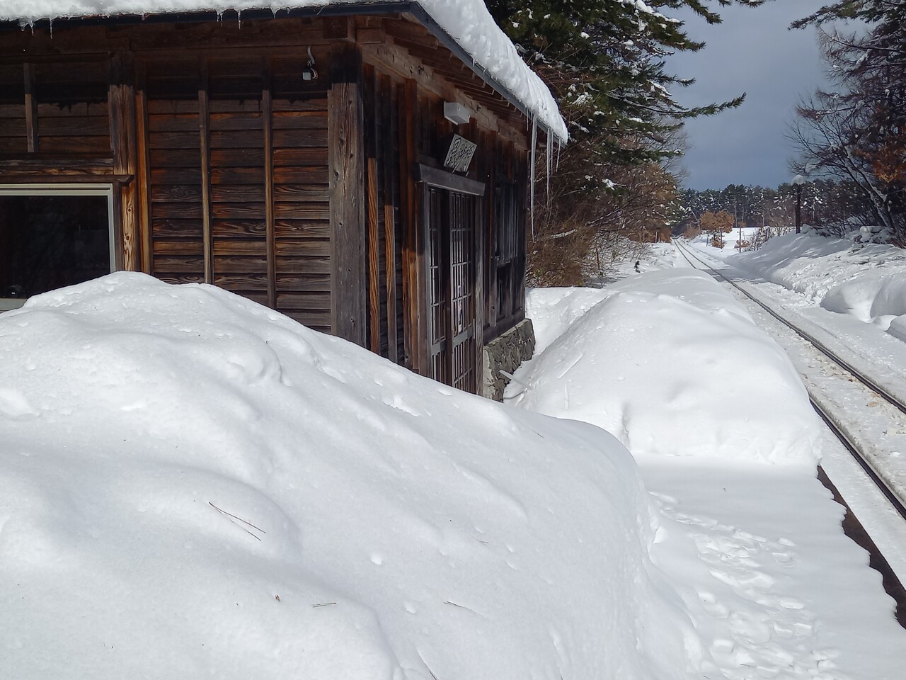 厳冬駅の訪問なため、降り積もった雪で駅の様子がまるでわかりません。利用者と事業者のみなさんが除雪をしてくれたおかげで辛うじて駅への出入口のルートは確保されているものの、ホワイトアウト状態で一見しただけでは難しいです。