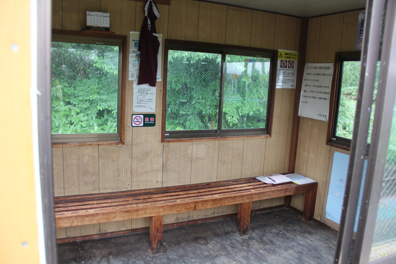 ホーム上の待合室も平成初期のこの手の無人駅でよく見られるプレハブ建物です。ホームに面した正面は板状の資材で補強されていて面目を一新しています。