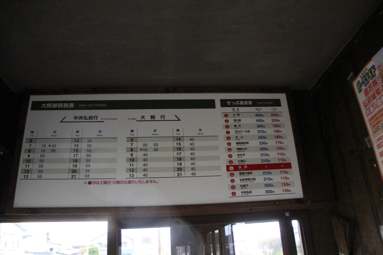 お馴染みのオレンジ地の駅名看板に薄いグレーの壁板で構成された建物、弘南鉄道の有人駅らしいツクリの駅です。