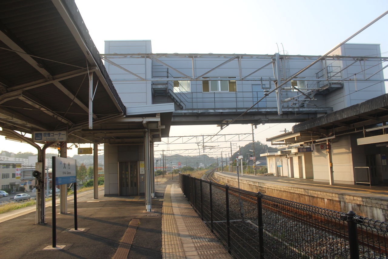 駅舎とは逆側には国道2号線が平行していて、さらに大門駅南のT字路からは工業地帯方面へ分岐する大きな道路が見えます。