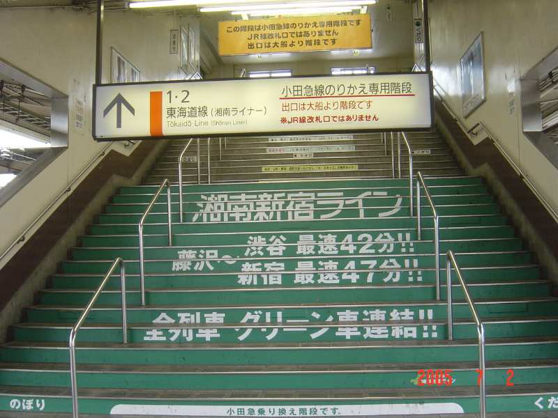 小田急線との乗り換え口へ至る階段にはこのように湘南新宿ラインへ誘導する広告が出ていました。