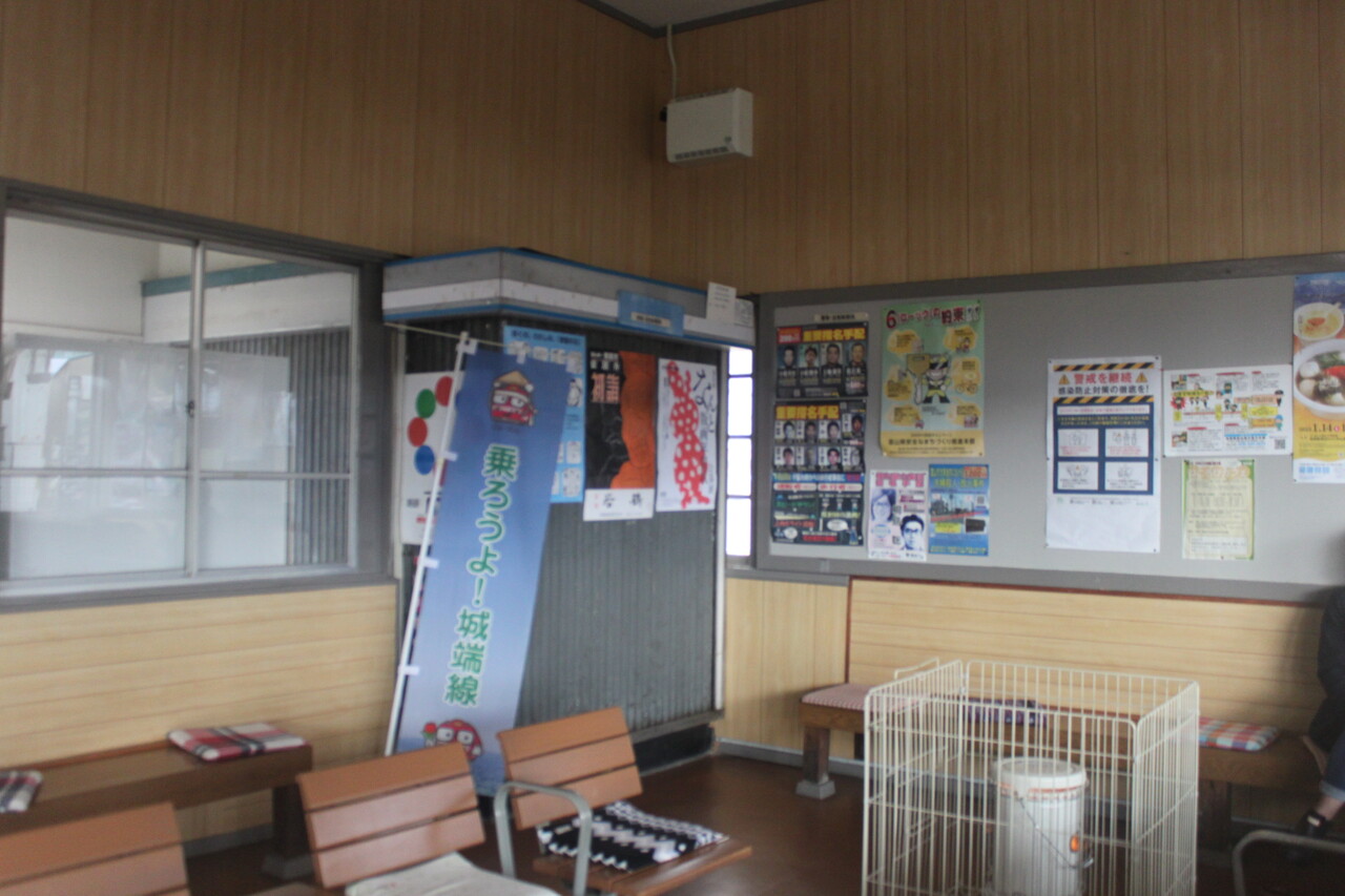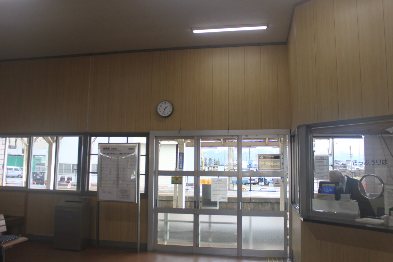 建物の内部です。出札窓口は簡易委託係員さんにより乗車券販売業務が行われています。改札業務は行われていない模様のように見えますが、列車到着前後以外は安易なのりばへの出入りはしずらい雰囲気です(普通入場券の購入が必要?!)。