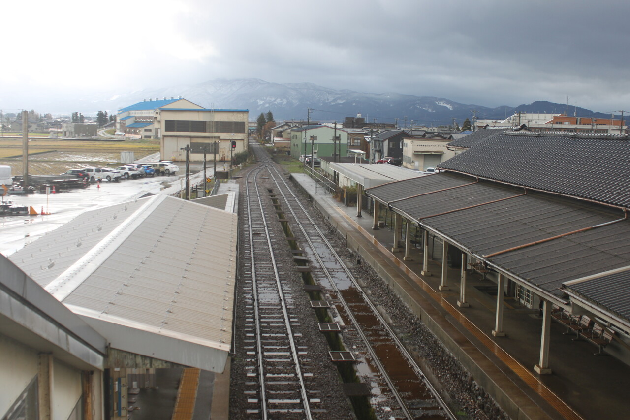 跨線橋から高岡方を見た図です。右側が駅舎です。