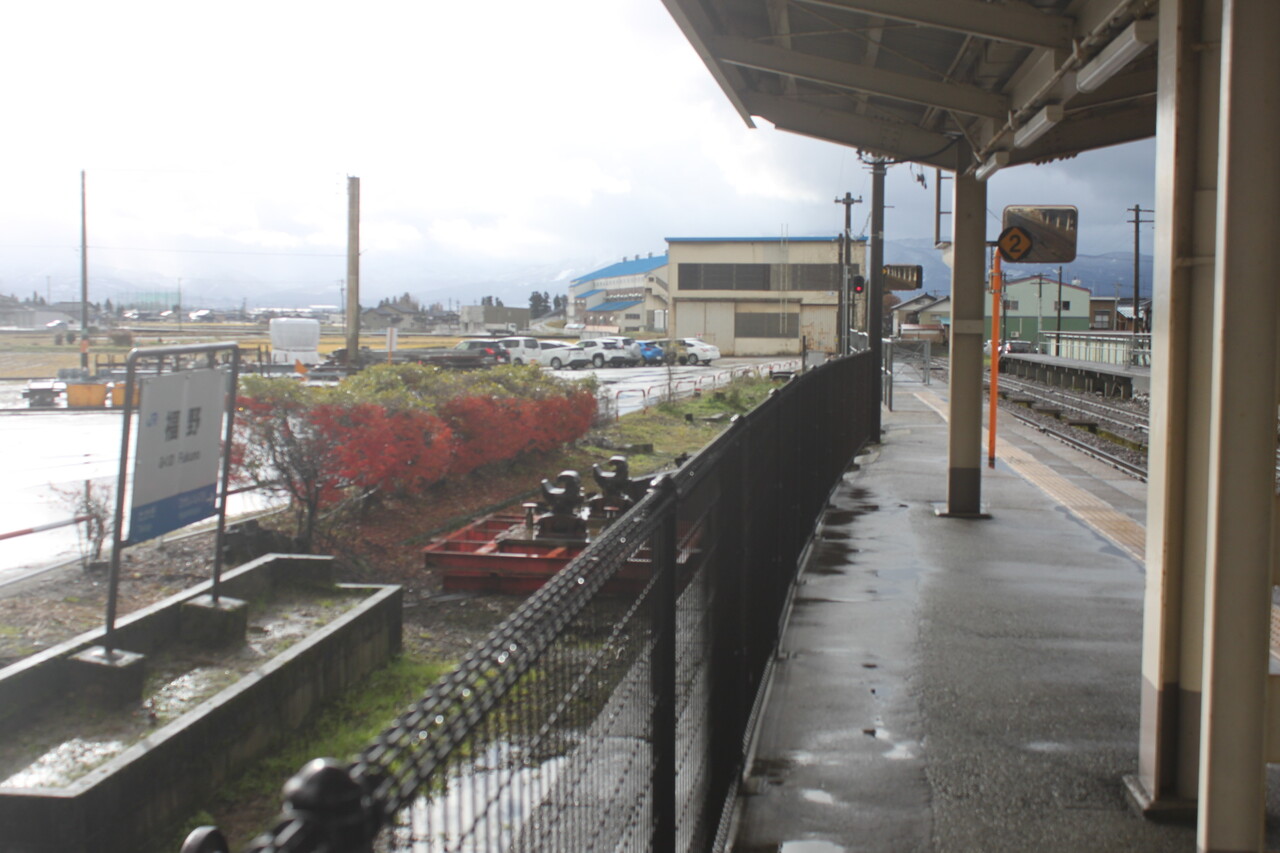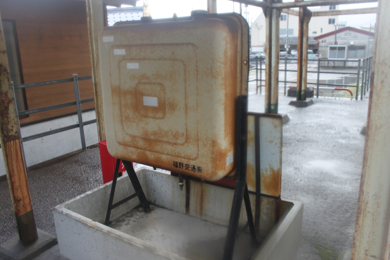 1番のりばの高岡方の一角には燃料タンクがあり、そこには小さく「福野交通((株)」と書かれています。これは恐らく当駅の簡易委託受託事業者さんの旧社名なのかなとみられます。
