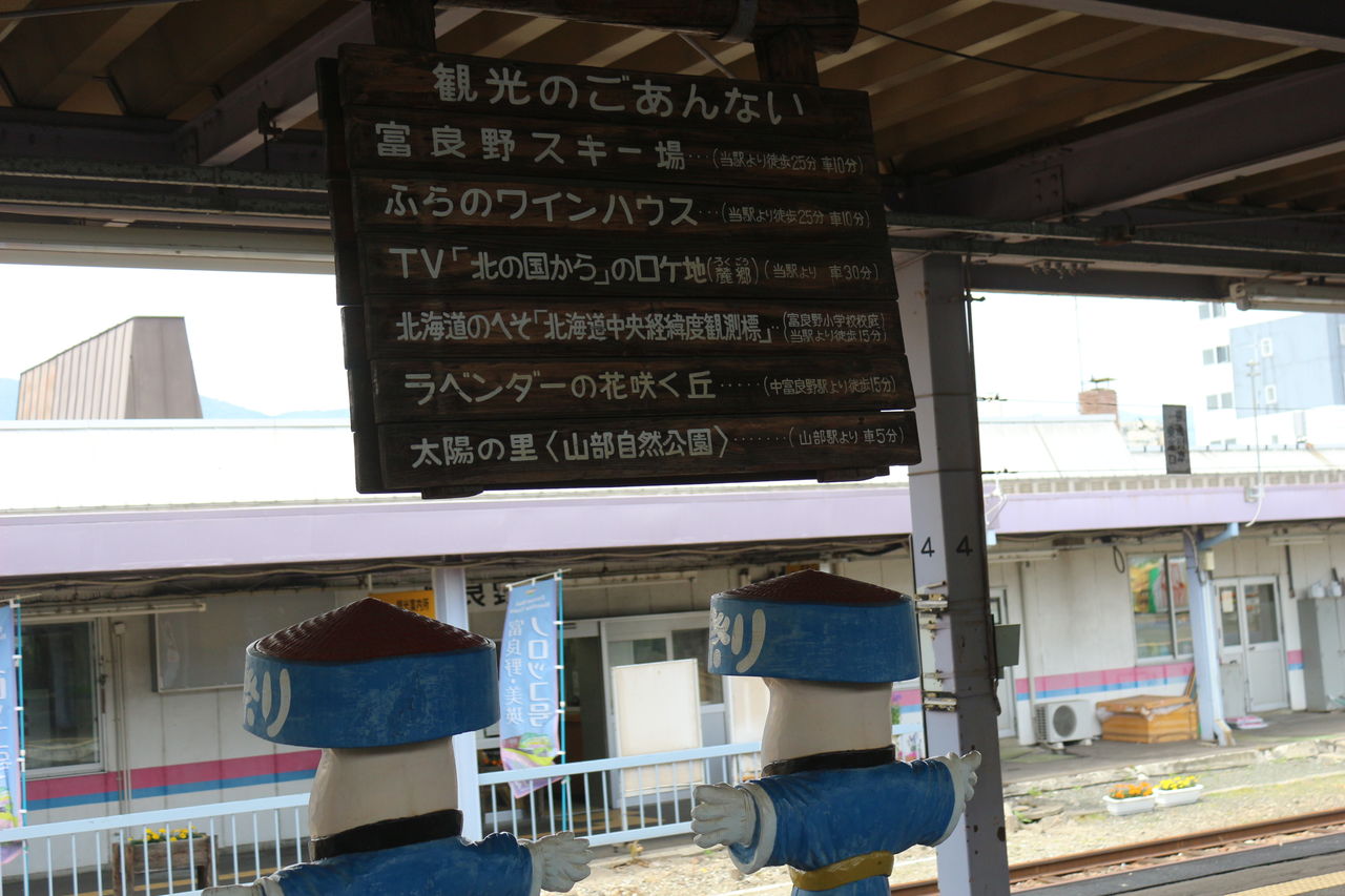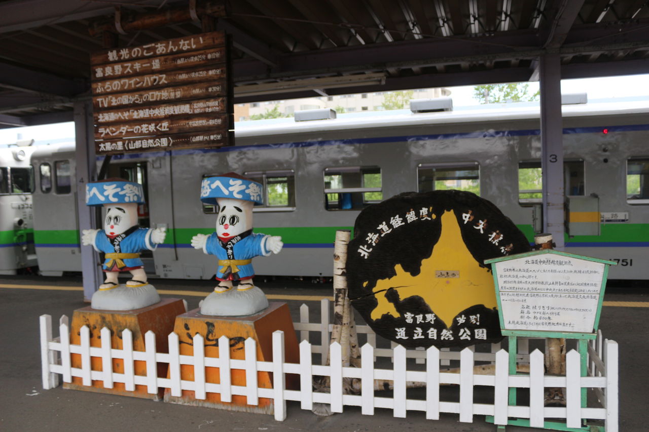 ホーム上に設置されている「北海へそ踊り」のモニュメント。なんで「へそ」なのかと言うと、北海道の地図をよ~く見ると富良野市は北海道の中心(へそ)にあることから、それに由来してお祭りにしてしまおうと考えたんだそうです。