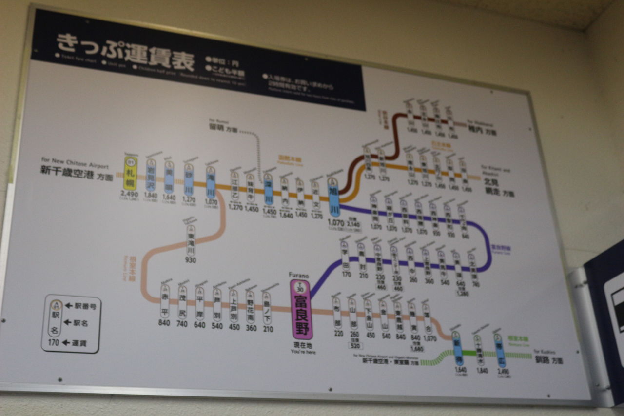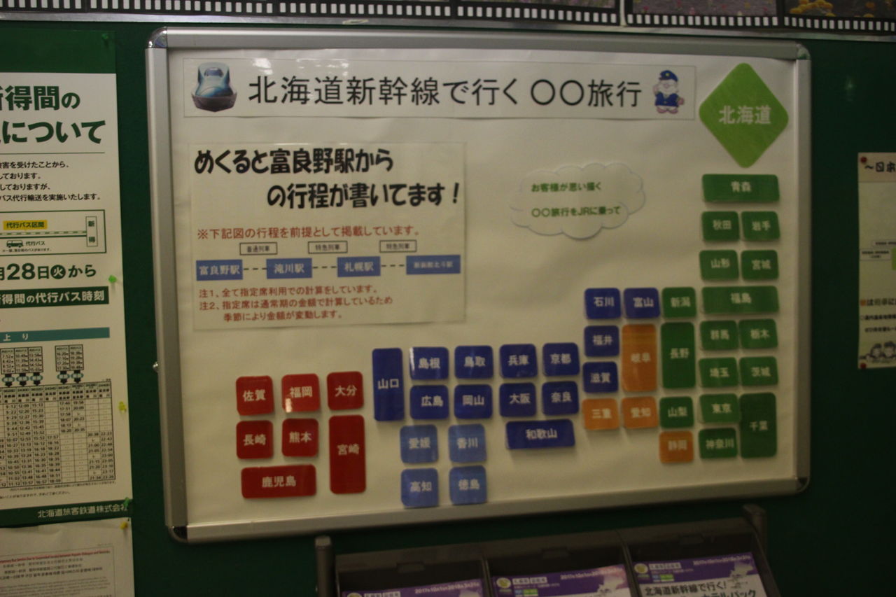 改札の脇には富良野駅から各都府県までの経路と金額がかかれたものが掲示されています。都府県名をめくると経路と金額がわかるという仕組みです。某クイズ番組(三〇の国〇りゲーム)と違い、めくっても坊主が出ることはありません。