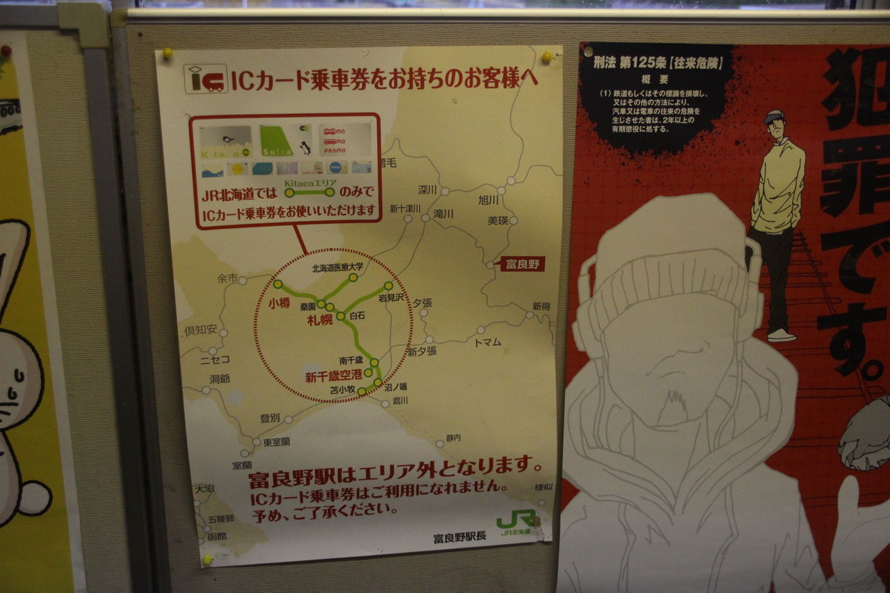 札幌近郊の駅で運用されているKitacaを始めとしたICカードのエリアから離れていることを示すポスターです。Kitacaエリアから乗換なしで当駅までやってくる手段が殆ど無いなかでこんなポスターがあるということは、普段からICカードで乗りこしてくる利用者が多いということなんでしょうか?