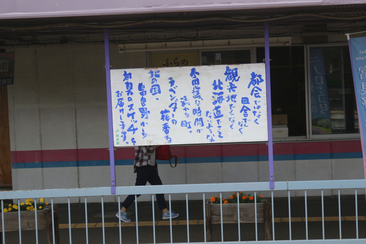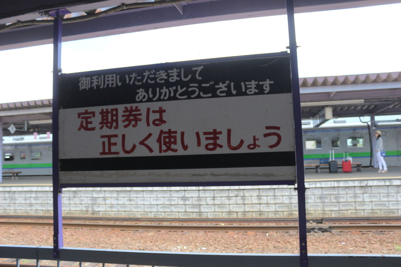 ホームから見えるこの看板。「都会でもなく、田舎でもなく、観光地でもなく、北海道でもない…」哲学のようなポエムが掲げられていますが、この看板の裏面にはこんな文言が…