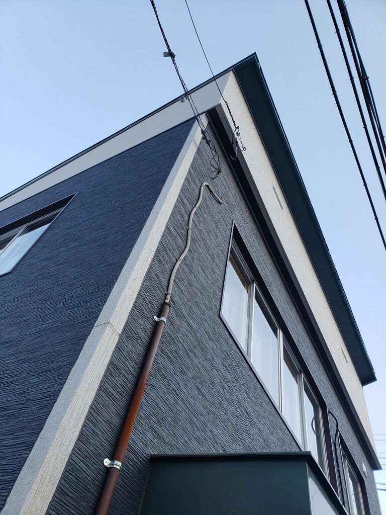 建物の側面には電気用ケーブル類が張り付いていますが、リフォーム以前は数本あったはずが1本にまとめられています。不要なケーブルは撤去したのでしょうかねぇ。