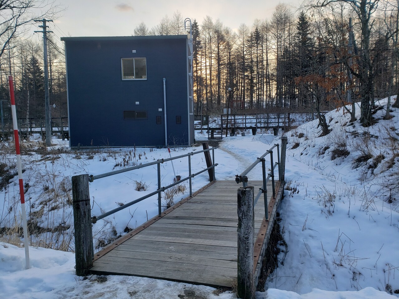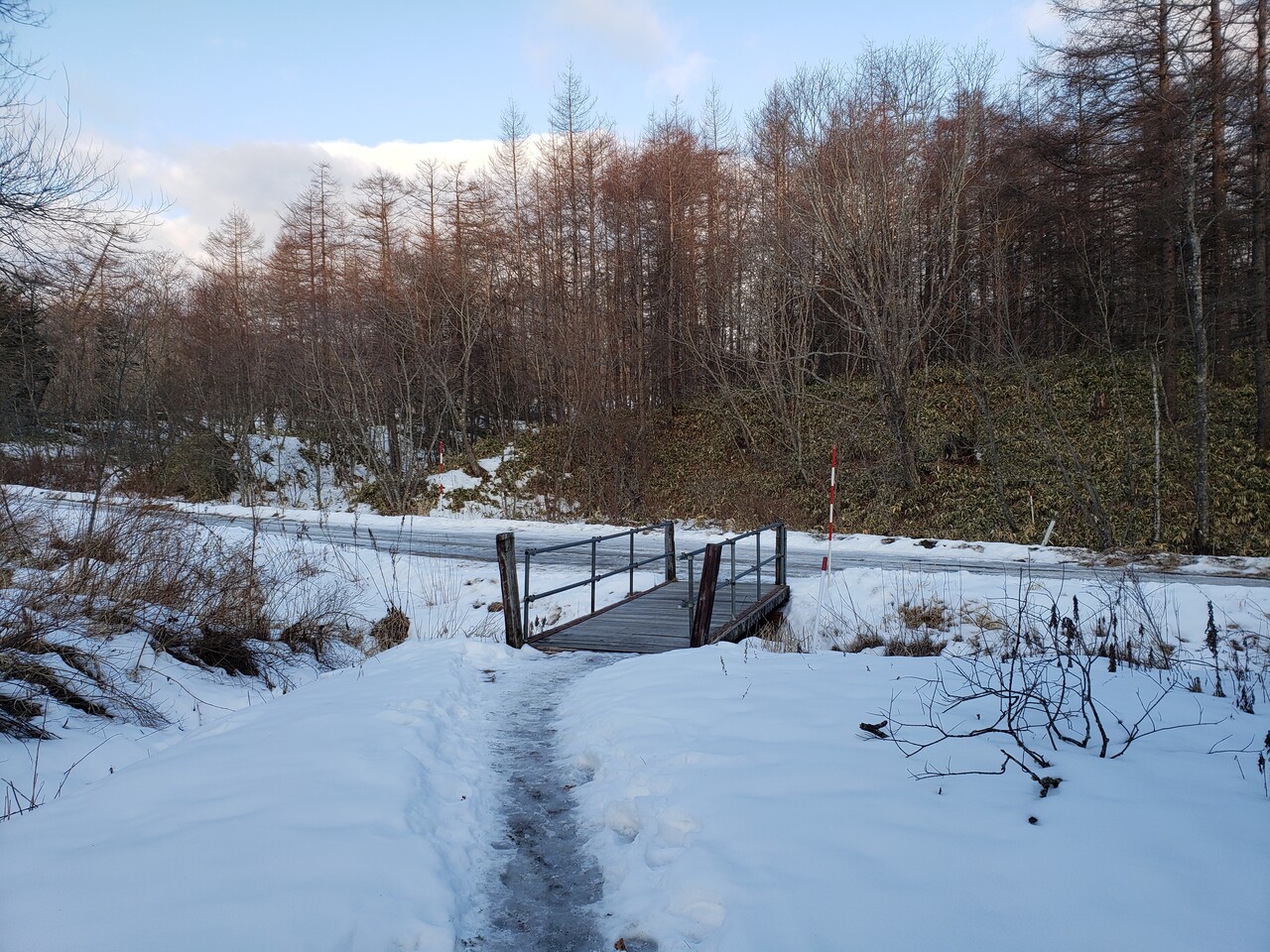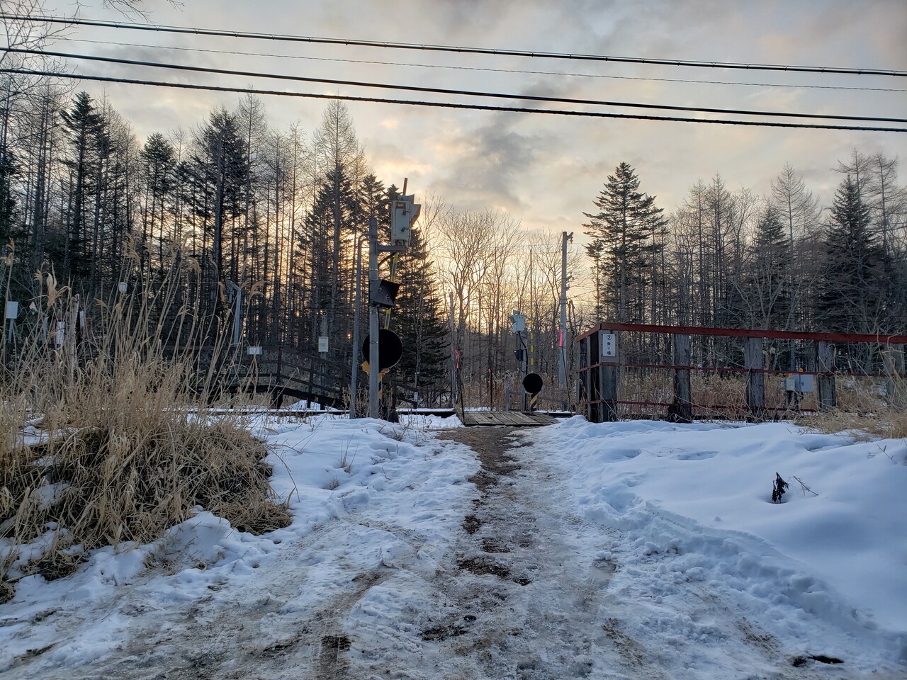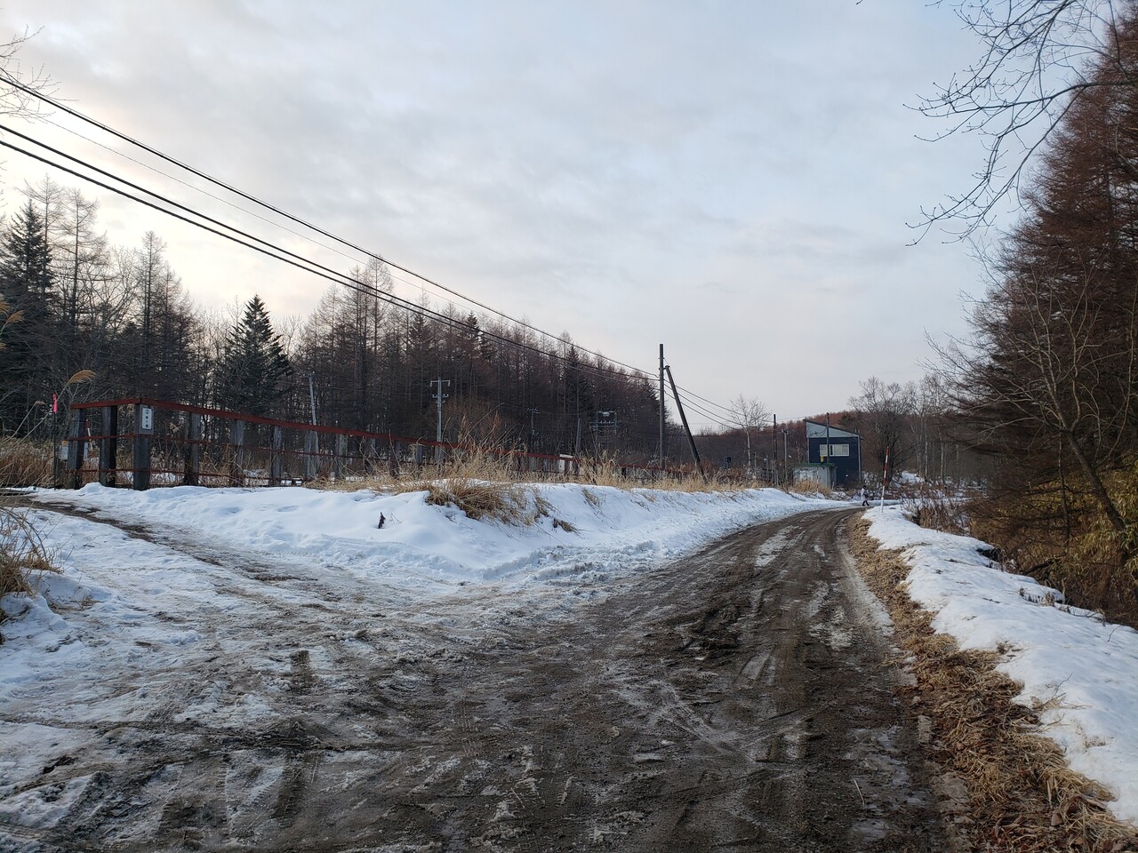 2003年訪問時は渡り板のみでしたが、2020年訪問時には簡素なパイプながら柵が設けられていて、安全対策が施されています。公道の道路と道路外を示すスノーポールと呼ばれる棒状の標識がないと冬季は足を踏み外してしまう恐れがありますね。