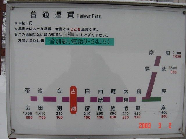 消費税5パーセント時代の運賃表です。問い合わせ先として音別駅の電話番号が掲載されていました。白糠駅が社員配置の直営駅ではなくなったタイミングでシールで番号を上書きする措置がとられていました。消費税率が8パーセント計算の釧路駅までの運賃は640円でした。