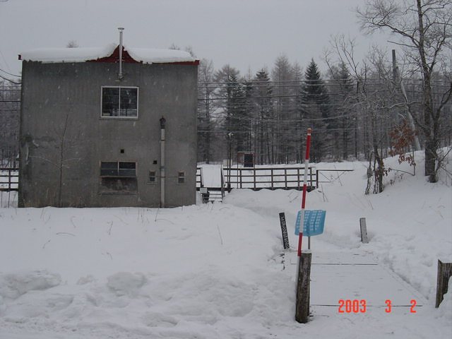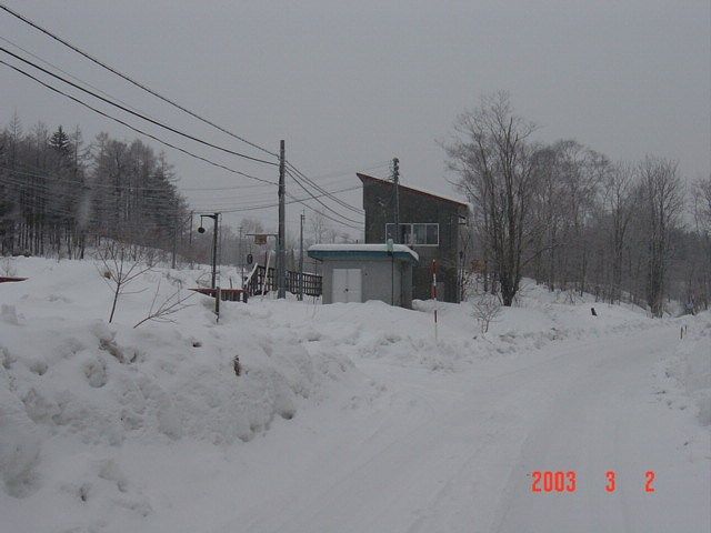 公道から敷地に入る橋と駅建物、そして奥に1番線ホームが見える構図です。2003年訪問時は雪に覆われていたためわかりませんが、スノーポールと除雪スコップが見える付近は水路が通っていて橋になっていました。