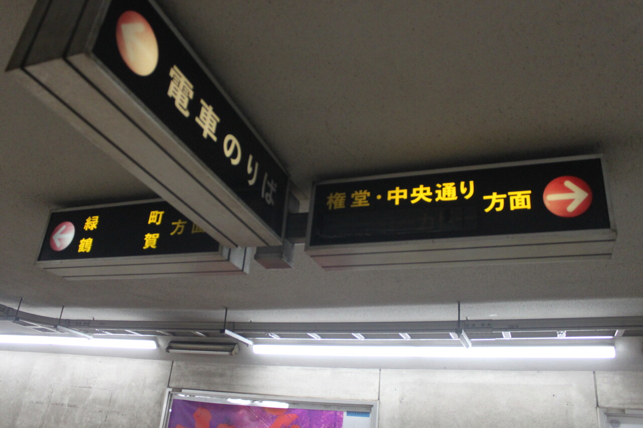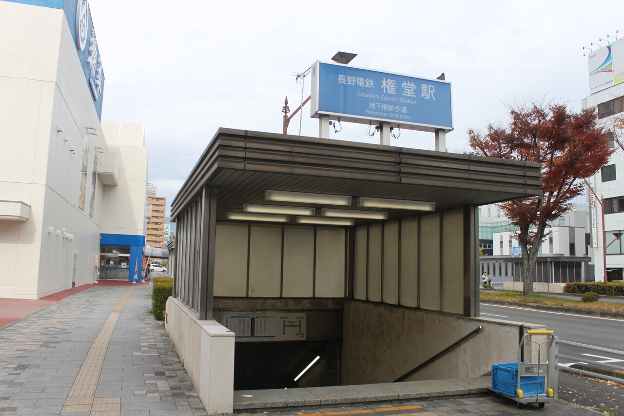 当駅長野駅から続く、地下駅です。長野駅前を左右に走る「長野大通り」を左右に貫く地下に設置されています。↑はこの周辺のランドマークだった旧イトーヨーカドー長野店(現綿半スーパーセンター権堂店)の横にある3番出入口です。