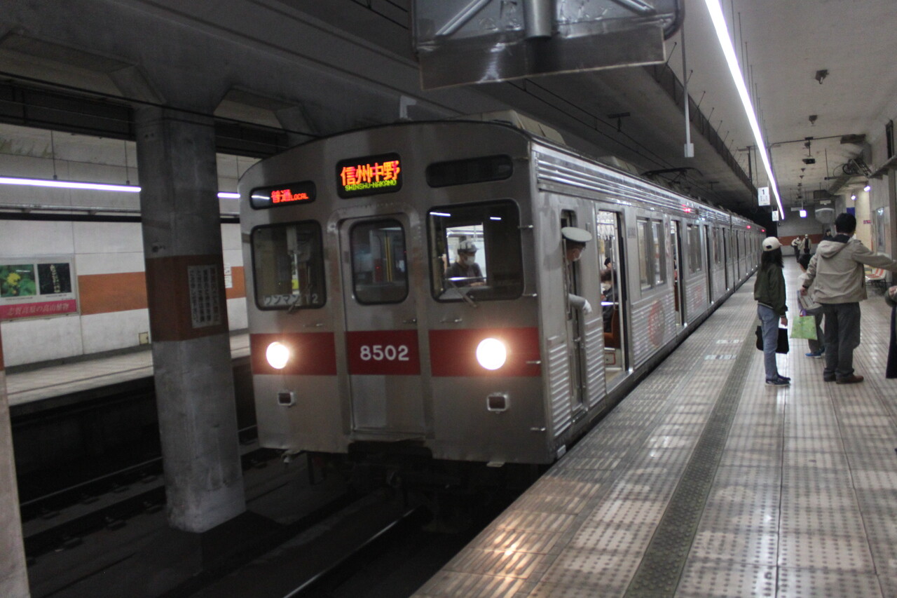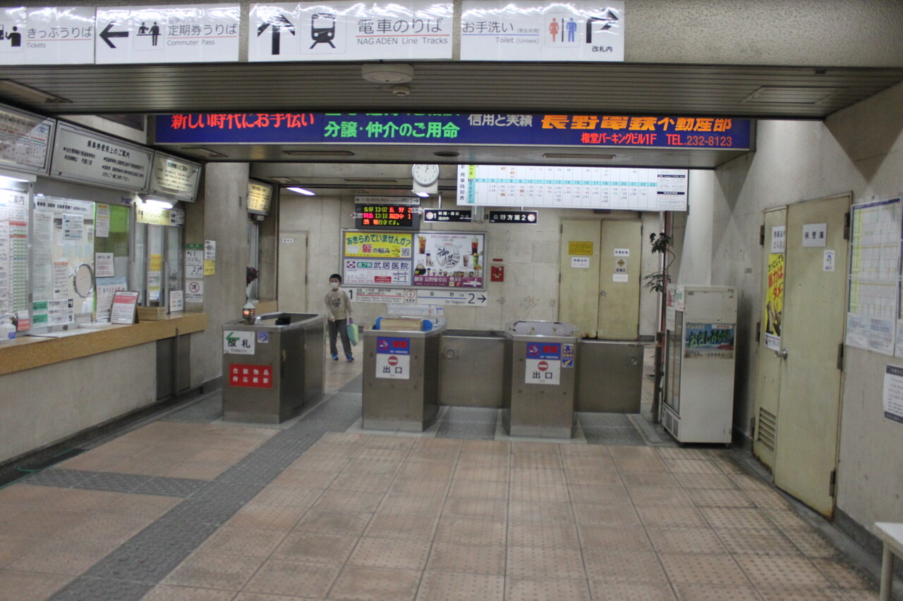 地下の改札口の様子です。長野電鉄の鉄道線は自動改札機が導入されていないことからこのような「ラッチ」が並ぶ様子が令和4年秋でも見ることが出来ます。いわゆる「地下鉄」でこのように自動改札が無いのは恐らく長野電鉄だけでしょうけど、長電の地下区間はいわゆる「地下鉄」ではなく「連続立体交差事業」なんですけどね。
