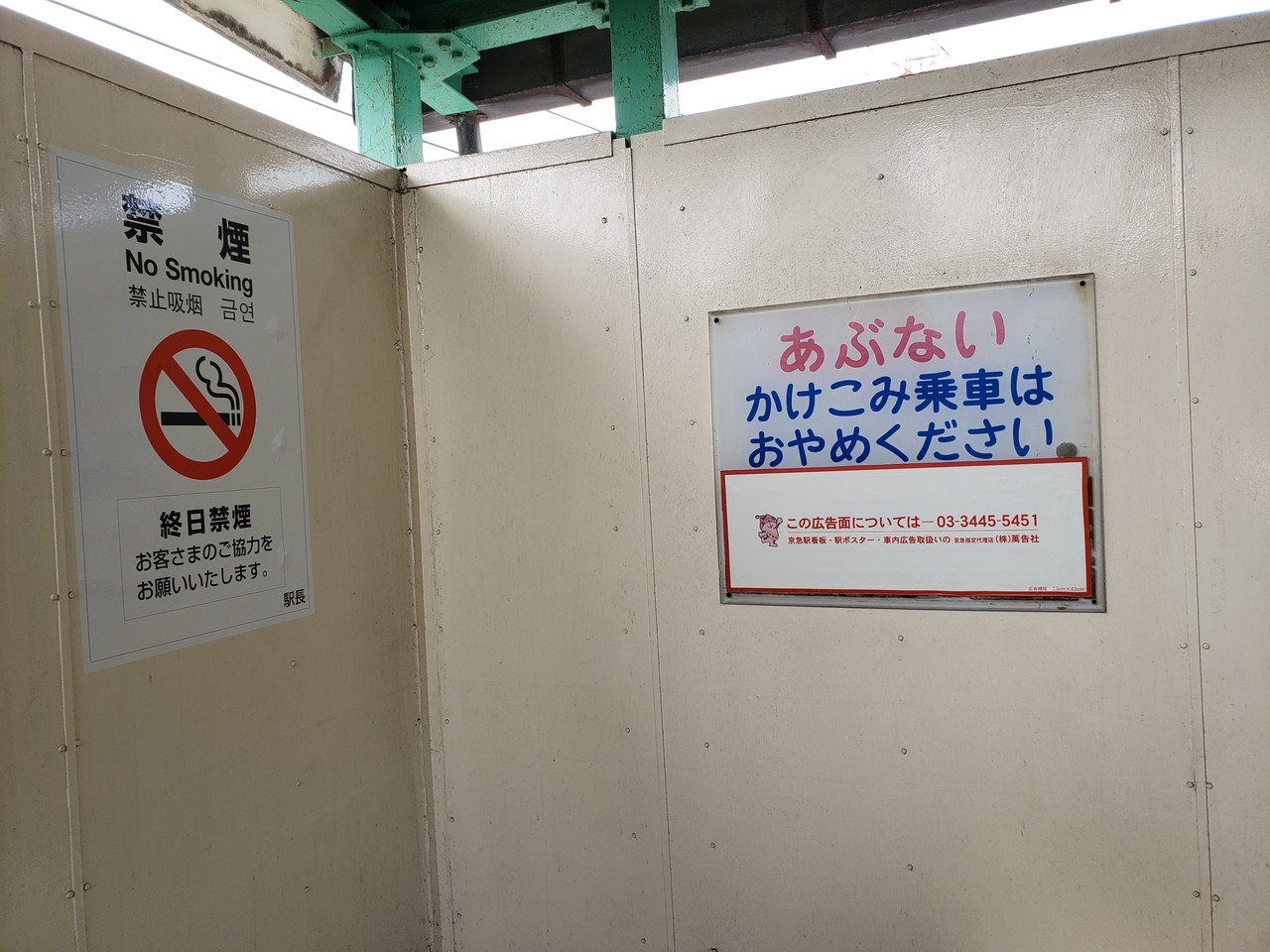 そんな当駅の中央口改札を抜けると、いきなり階段があります。中央口改札駅舎は横浜方面1番線ホームに直結していて、羽田空港・品川方面ホームへは階段の登り降りが必要です。その階段の途中にある禁煙を促すステッカーは・・・
