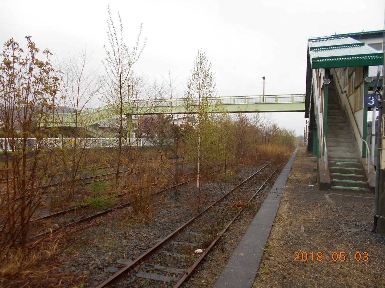 4番線に見える部分は使用しておらず、ホーム番号の割り当てもありません。貨物列車で賑わっていたであろう側線は線路の間から草木が生い茂っていて、見るも無残な様相を呈しています。