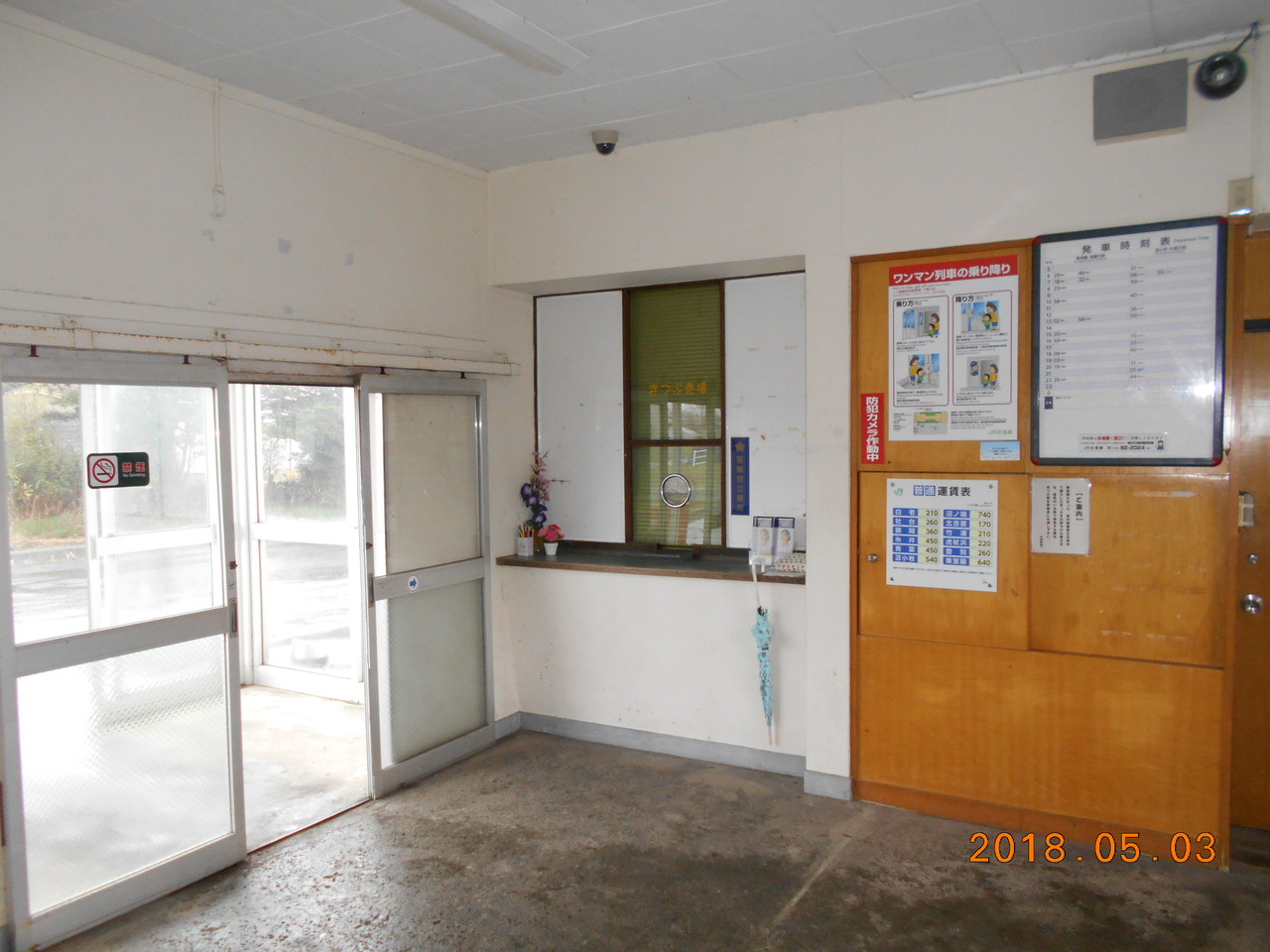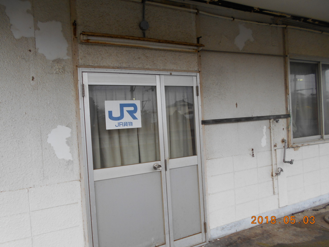 当駅舎の線路側にはJR貨物のマークが入った出入り口があります。といっても貨物列車が当駅にやってきていたのは2008年までで、当駅から引込線を解して前述の日本製紙工場への貨物列車が出入していました。JR貨物の係員詰め所跡や後述する側線の跡はその名残りです。