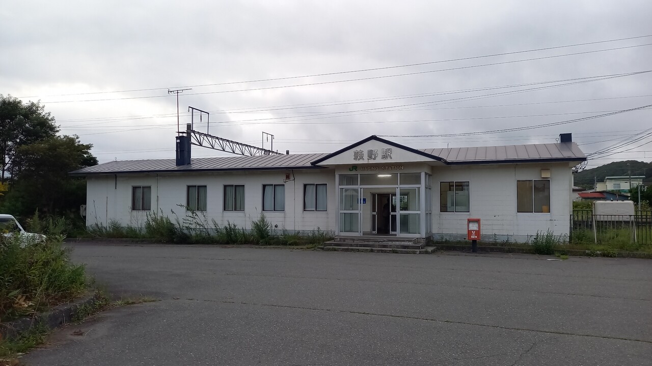 「おぎの」ではなく「はぎの」です。信号場(このときは「知床(しれとこ)を名乗る)として設置され、その後は「貨物駅」→「一般駅」と変貌する出世駅です。駅舎は白を基調とした平屋建ての駅で、貨物取り扱いがあったため、事務スペースが広く確保されているのが特徴です。