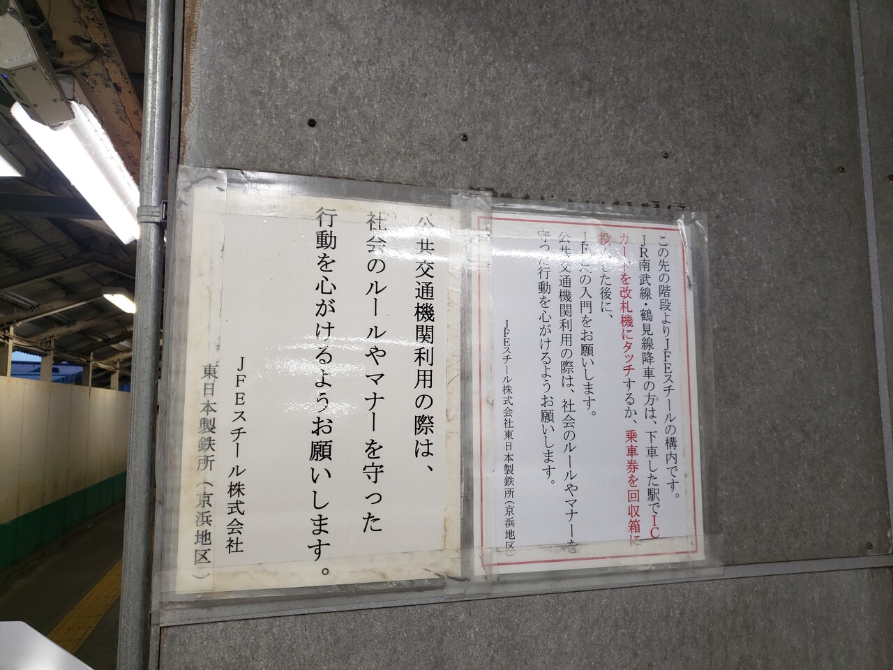 当駅の跨線橋はJFEスチール株式会社の渡田西門も兼ねているようです。鉄道利用以外のJFEさんへの関係者さん・用務客さんもこの跨線橋を横断するように案内されています。