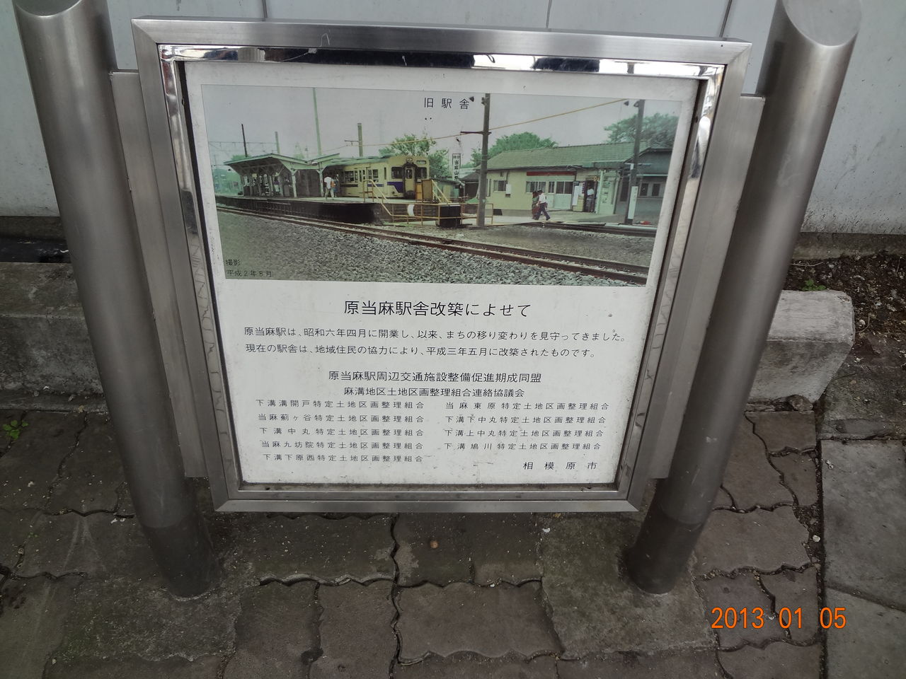 当駅は1991年の相模線電化完成にあわせて現在の橋上式の駅舎へ建て替えられましたが、それ以前の様子を記したものが東口駅前に設置されていました。それがこれ↓