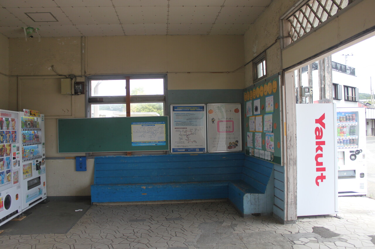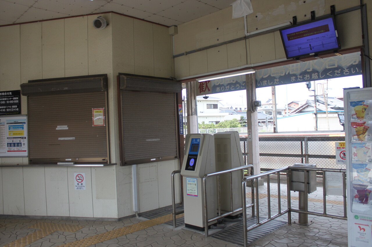 駅舎建物内部の様子です。平成30(2018)年3月で駅係員の配置を終了し、無人駅となっています。令和2(2020)年からはICOCAが使用できるようになり、交通系ICカードの簡易改札機が設置されています。