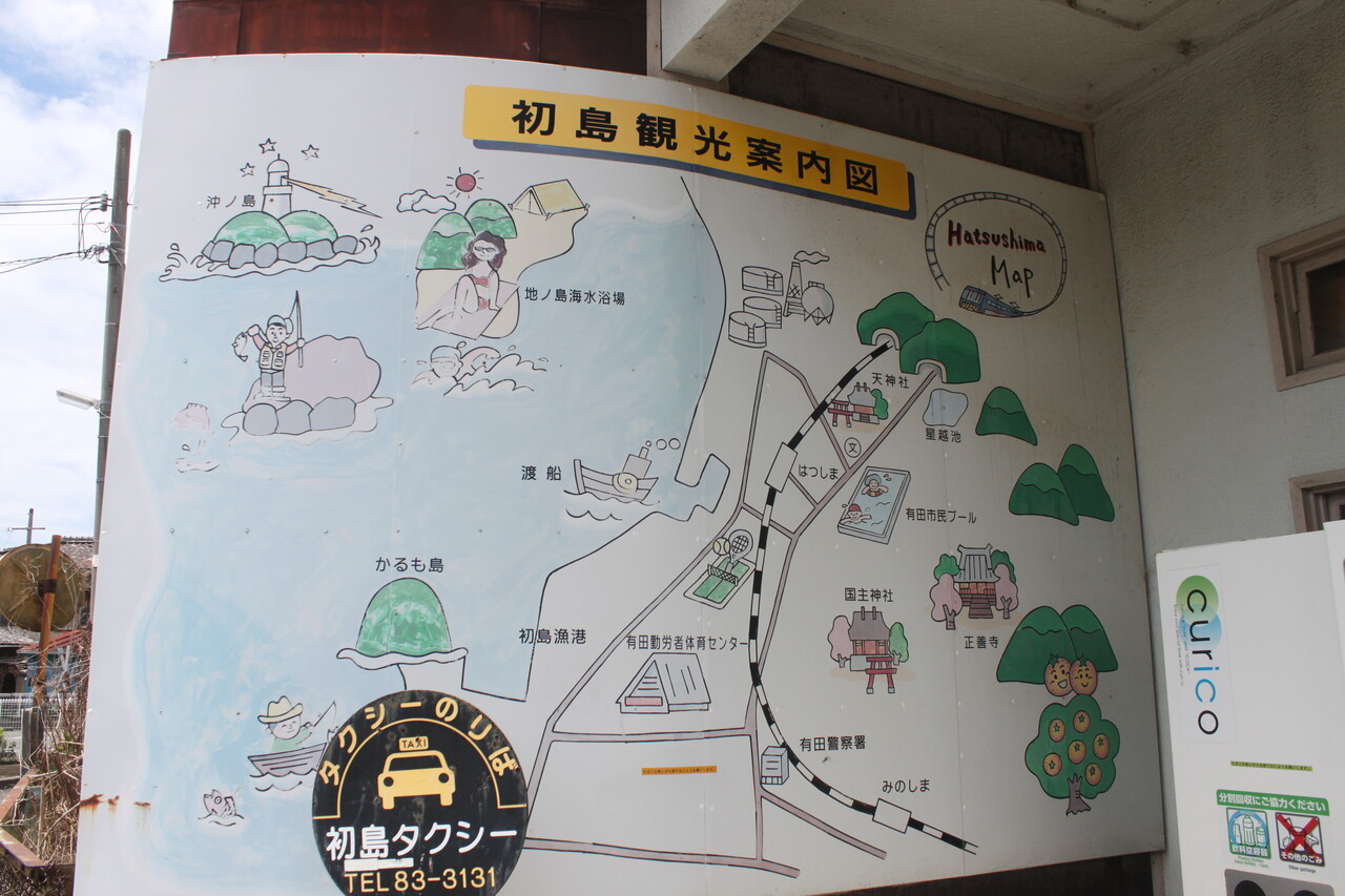 駅舎正面には観光案内図が、、、沖ノ島海水浴場ってのがあって、当駅最寄りの渡船業者さんに依頼すると有料で沖ノ島無人島行の船を出していただけます。