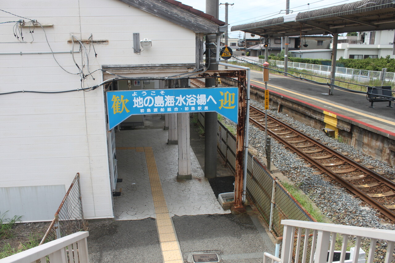 跨線橋から駅舎を見ると「ようこそ地の島海水浴場へ」の看板が出ています。