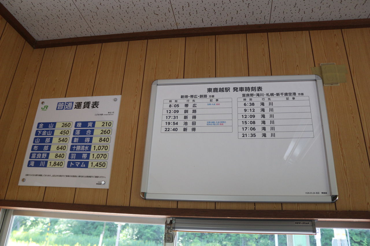 列車本数はこの通り。新得方面の下りは5本、富良野方面の上りは6本の列車が停車します。運賃表にトマム駅までの金額が掲載されています。上落合が駅ではなく信号場なので、上落合信号場~新得駅間の往復分も金額計上しているからなんでしょうね。ちなみにトマム駅~幾寅駅間の占冠町営バス運賃は450円。当駅~幾寅駅間の運賃210円を加味しても660円とだいぶ割安ですな。