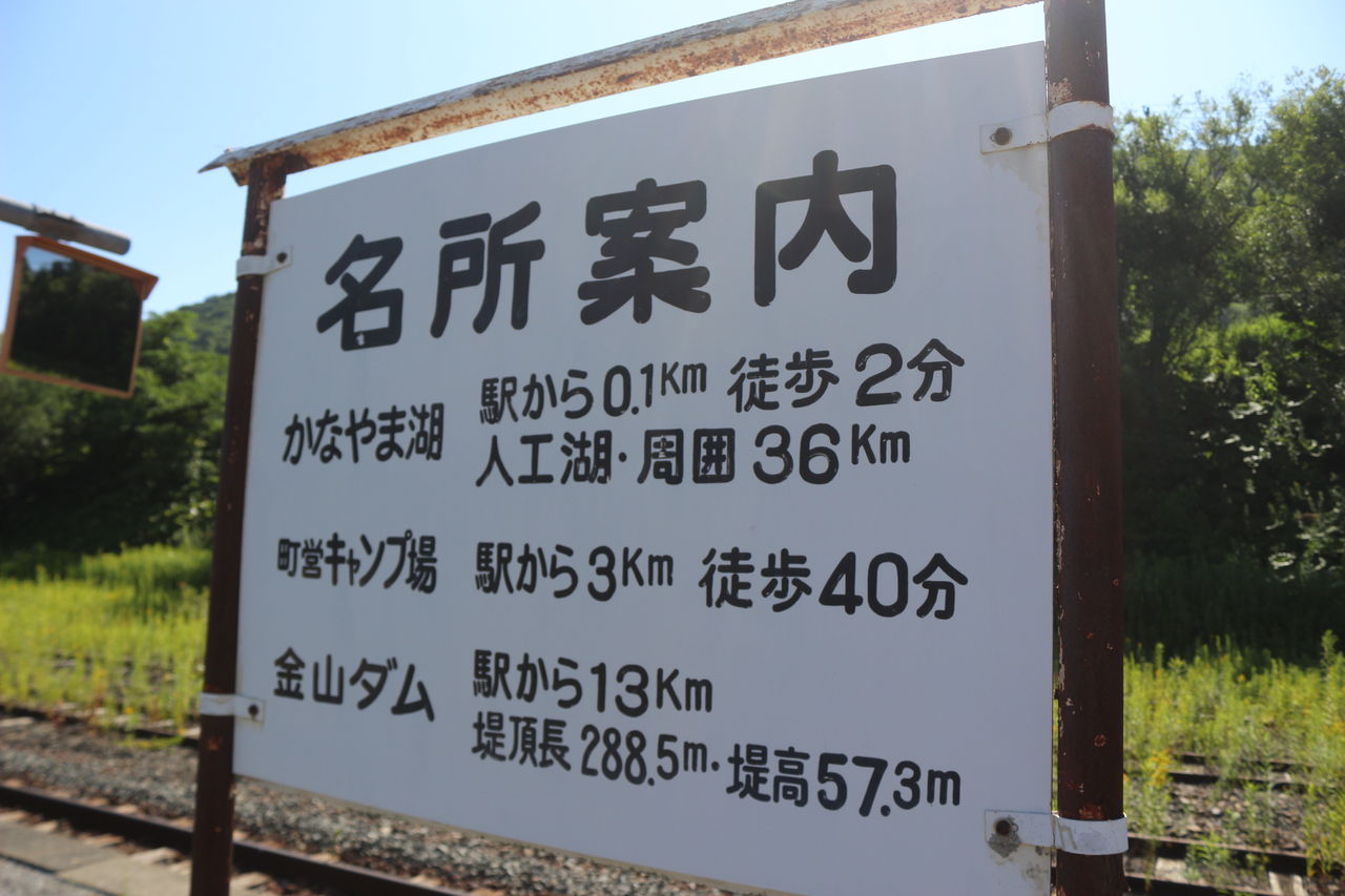 ホーム上には名所案内の看板が設置されていて、かなやま湖関連の案内が書かれています。