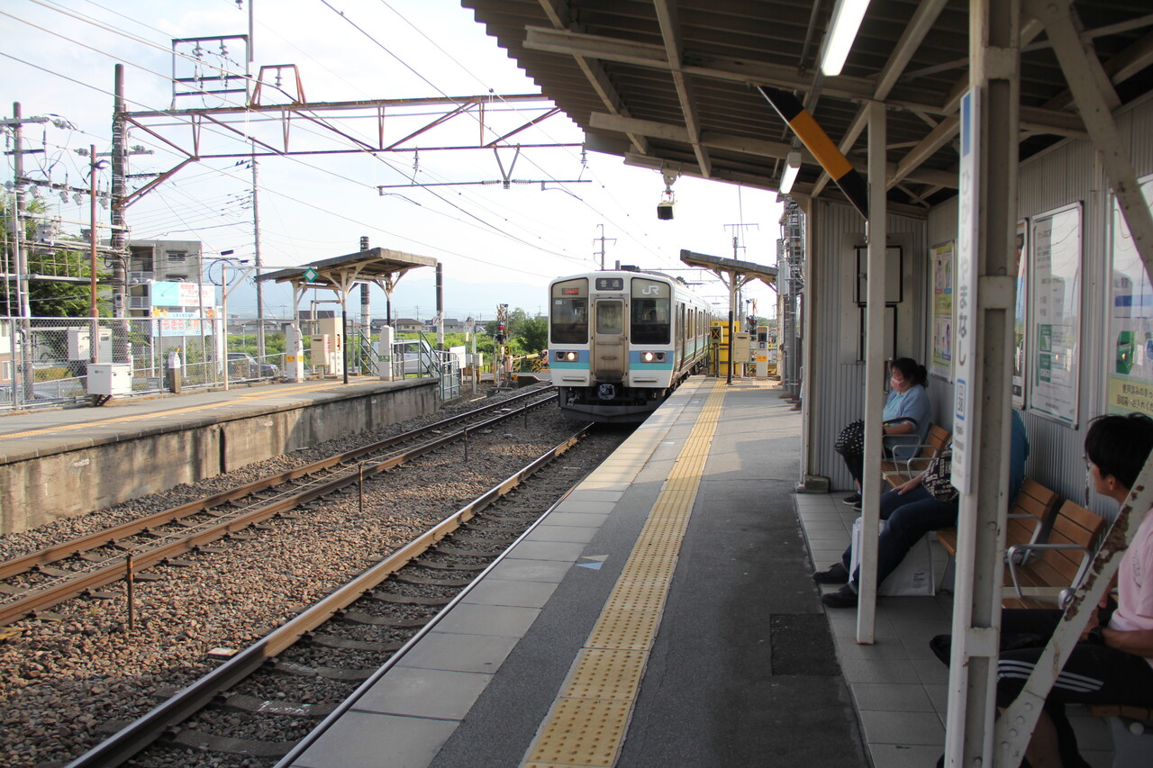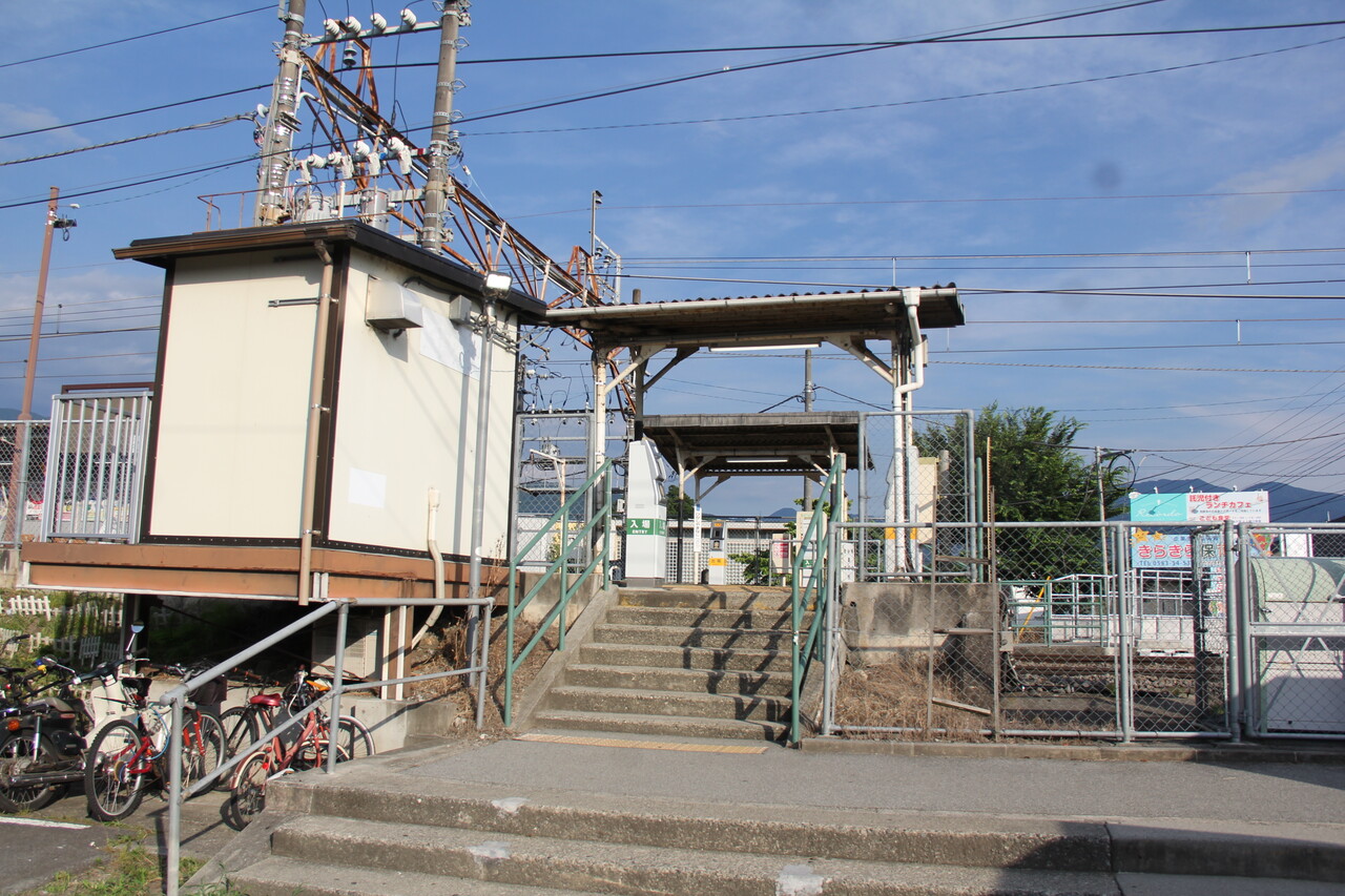 山梨市の郊外にある小さな無人駅です。駅の出入口は上下線で別個になっています。