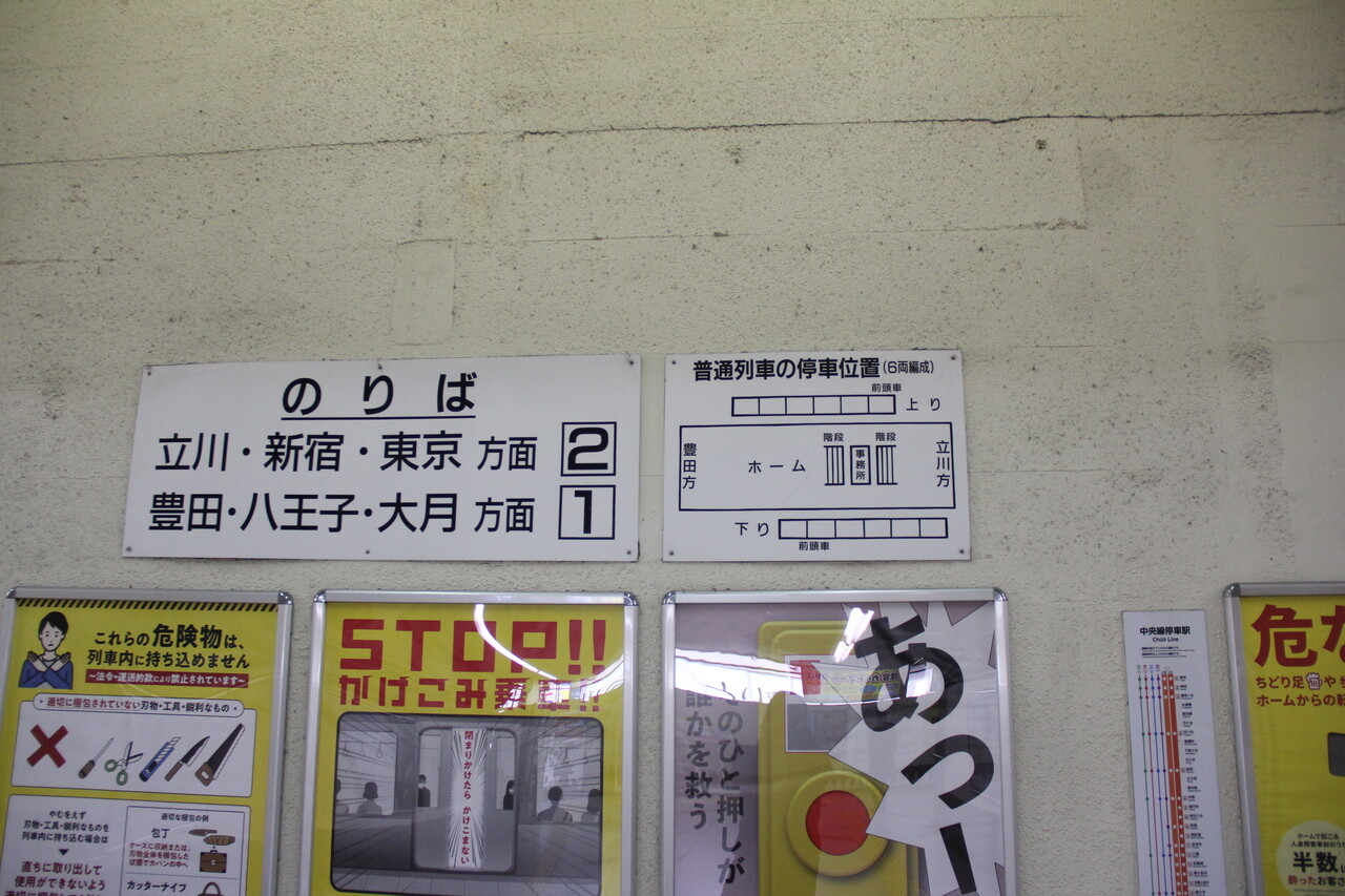 のりば案内の脇には普通列車の停車位置(6両編成)という看板が出ています。これは当駅19時台に1本設定されている甲府行普通列車のことを示しているようです。