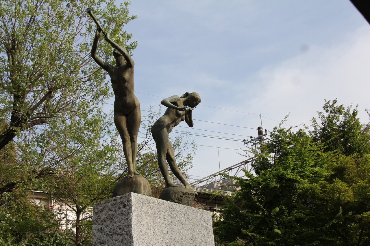 「グリーン グリーン ハーモニー」と称されているこの像は1983年に建立された三木俊治さんの作品で、中央には平和のシンボルとして鳩がいます。まさか「鳩=ハート」というダジャレ要素も含まれているのでしょうか。。。