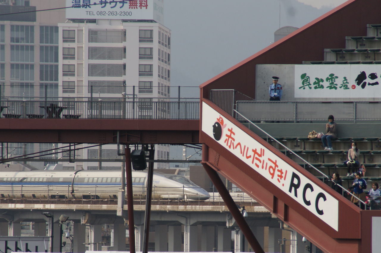 新大阪方面行列車が当駅を出ると右手にマツダスタジアムが見えます。新幹線は高架を走行するので球場内からも新幹線の走行シーンが確認できるので、野球と鉄道が好きな人にとっては楽しい球場です。