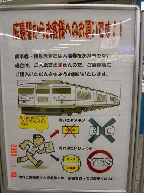 駅と球場の間のJRのフェンスにはこんな看板も…山陽線の線路は前田健太のようにカーブしていたり、セノハチの急こう配は一岡竜司のフォークボールのような線形だというのに、改札機はストレートのようです。この看板の近隣にある踏切には他ではあまり見かけない電飾が…