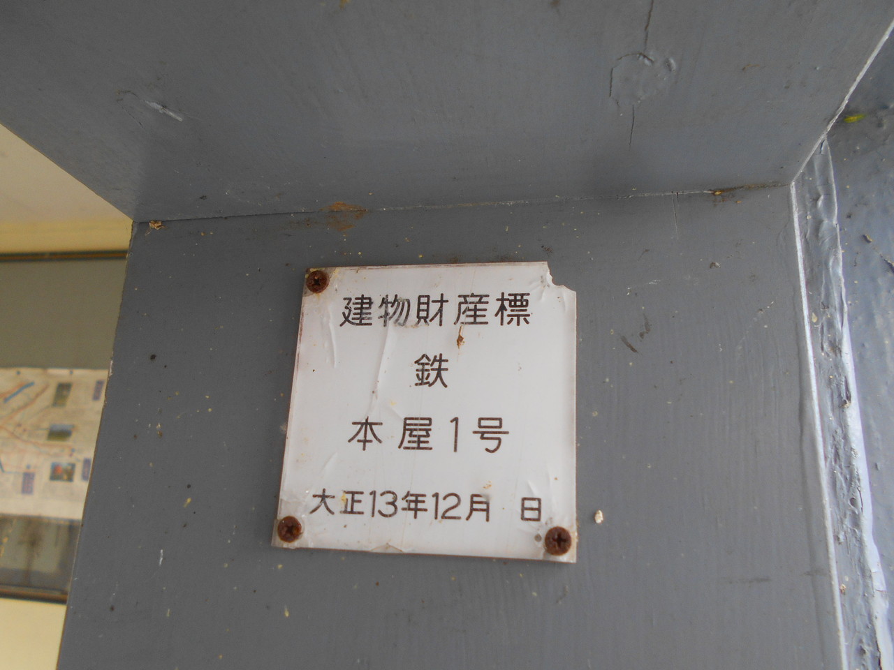 建物には大正13年12月竣工を示す建物財産標が貼付されています。1964年の貨物取り扱い終了、1986年の無人化を経て、不要な事務所部分などを削ぎ落とし(減築)、現在のようなスリムなスタイルの建物に変化しています。
